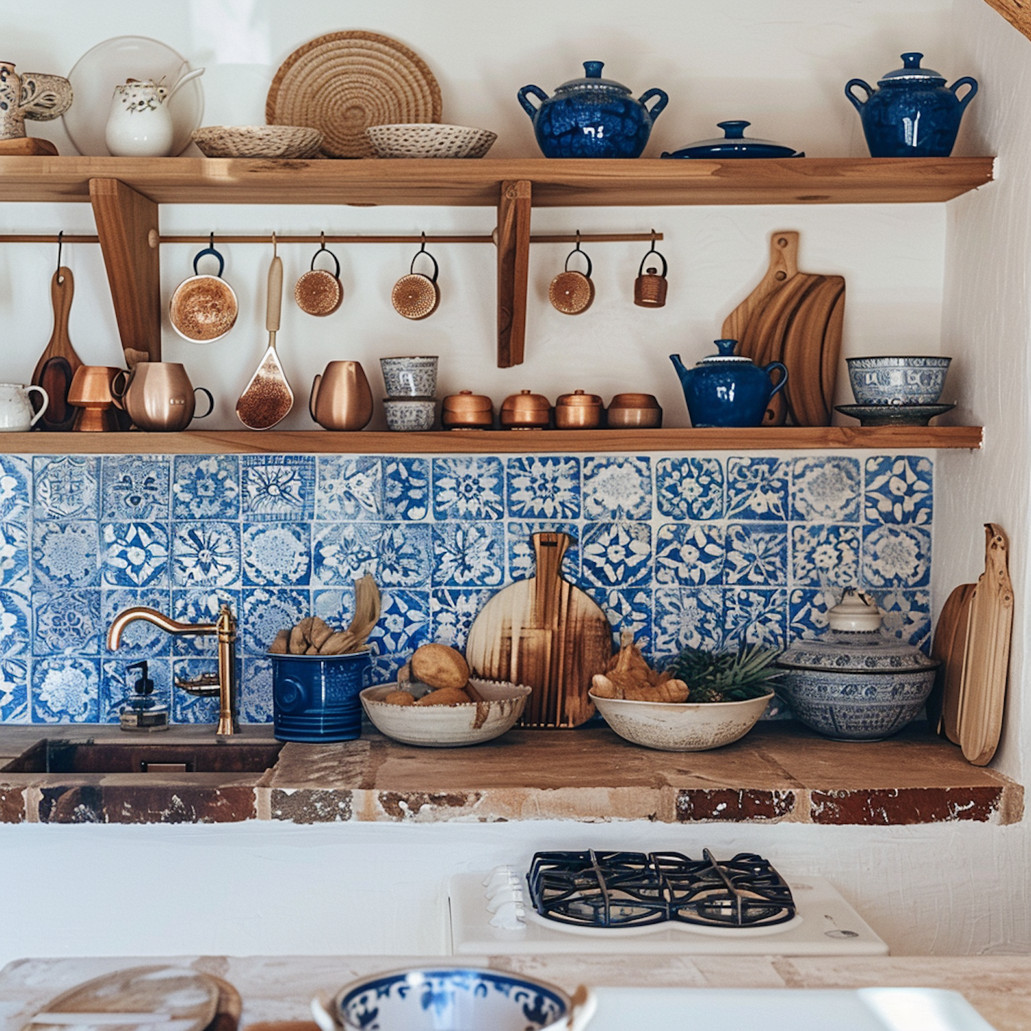Rustic kitchen with blue ceramics, copper utensils, and patterned tiles. Cozy and artistic ambiance with wooden shelves and cutting boards.