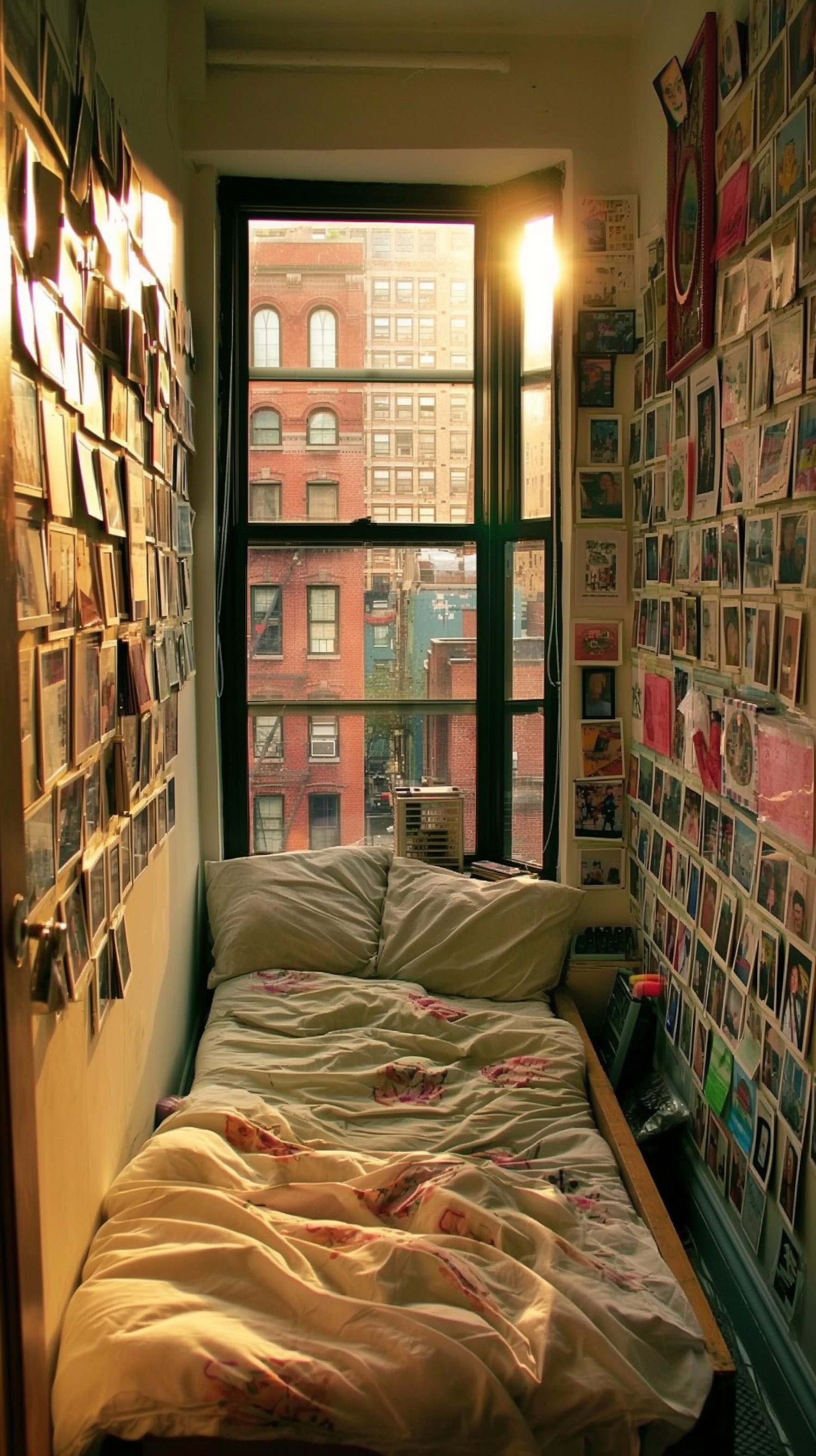 Cozy bedroom with a single bed, floral duvet, and walls covered in photos. Sunlight streams through a window, creating a warm, nostalgic vibe.