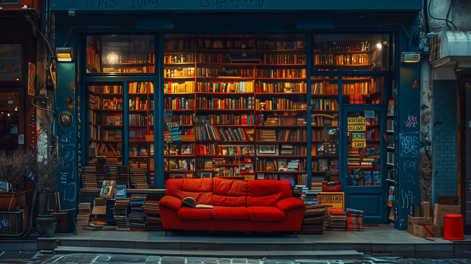 Cozy bookstore with a red couch outside, packed shelves, and warm lighting. Urban vibe with graffiti and posters on the exterior.