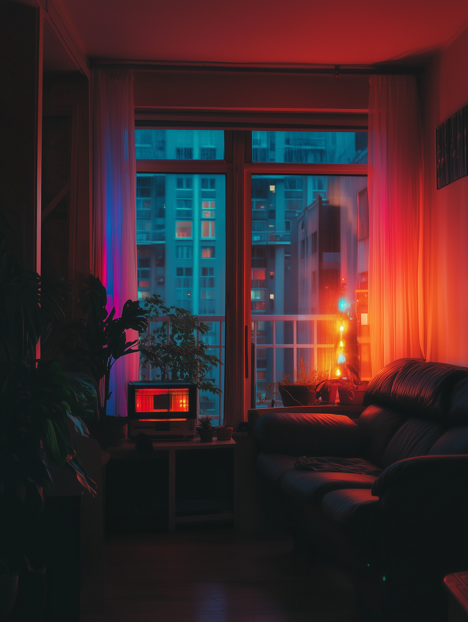 A cozy living room with warm lighting, a retro TV, potted plants, and a view of city buildings through a large window at night.
