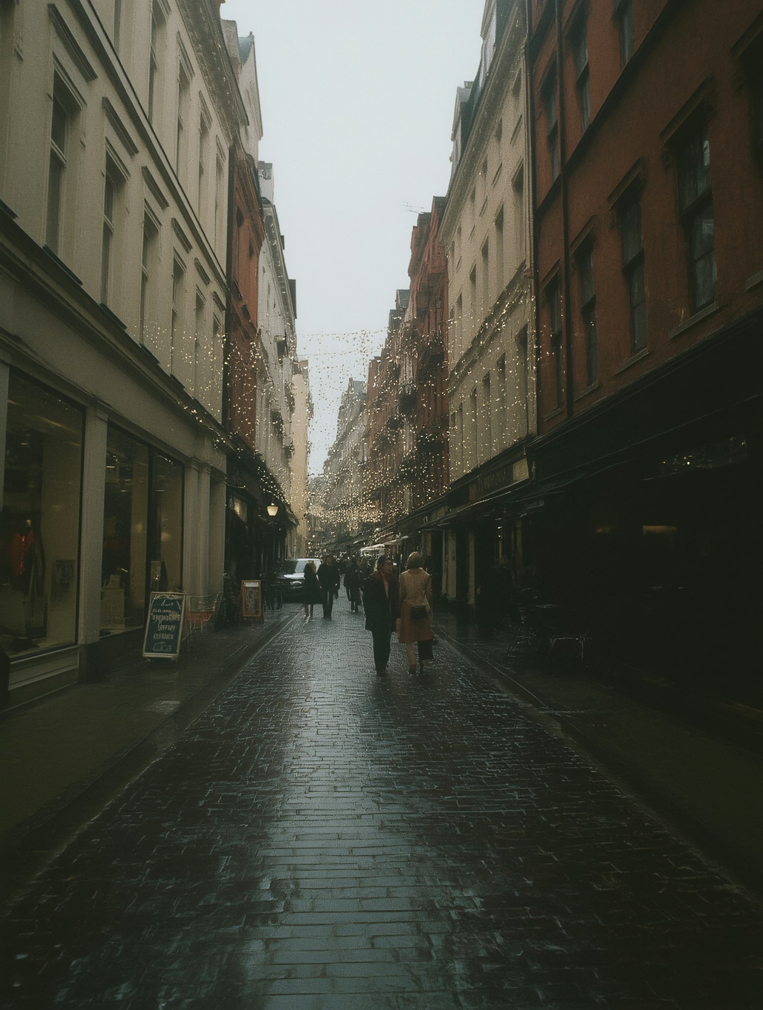 Charming cobblestone street with festive lights, historic buildings, and pedestrians enjoying a cool, overcast day.