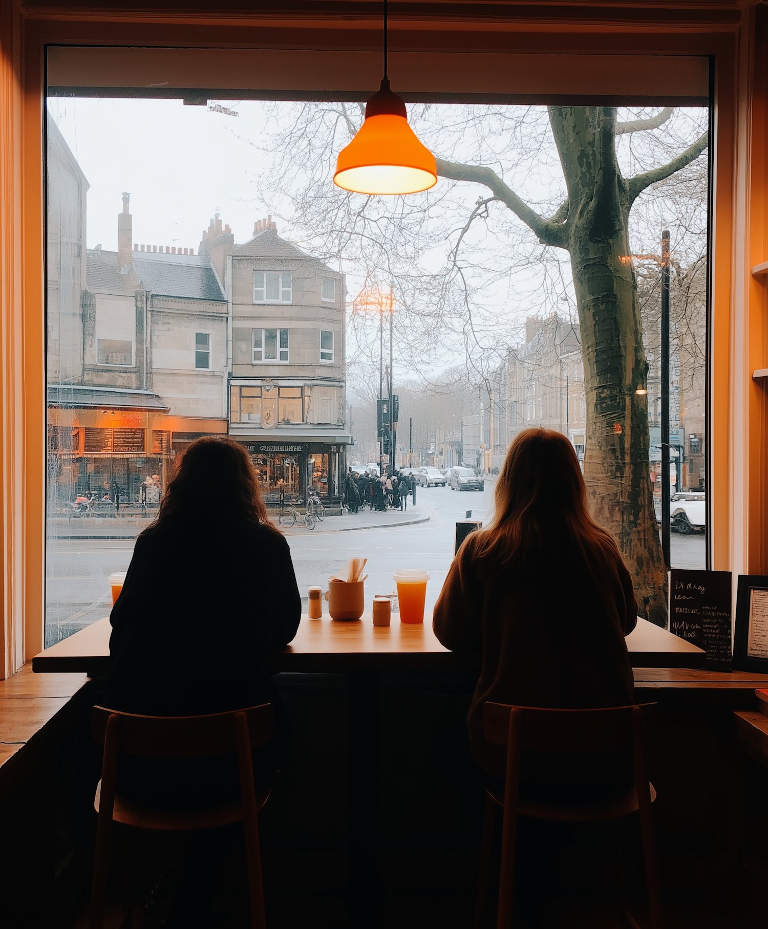 Two people sit in a cozy cafe, silhouetted against a large window with a view of a bustling street and historic buildings.
