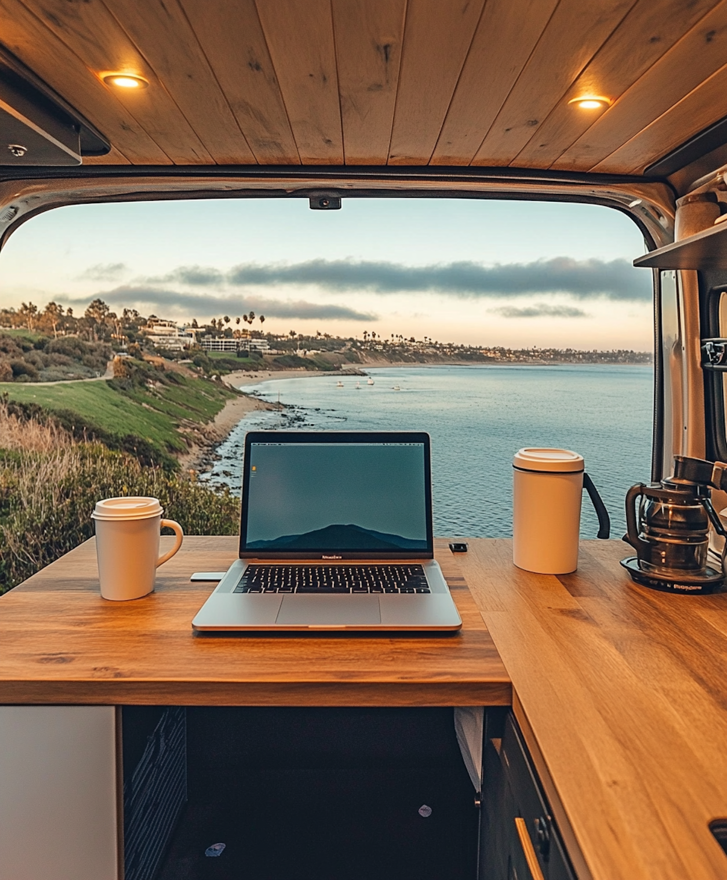 A laptop and coffee setup in a van with a stunning coastal view, perfect for remote work or travel inspiration.