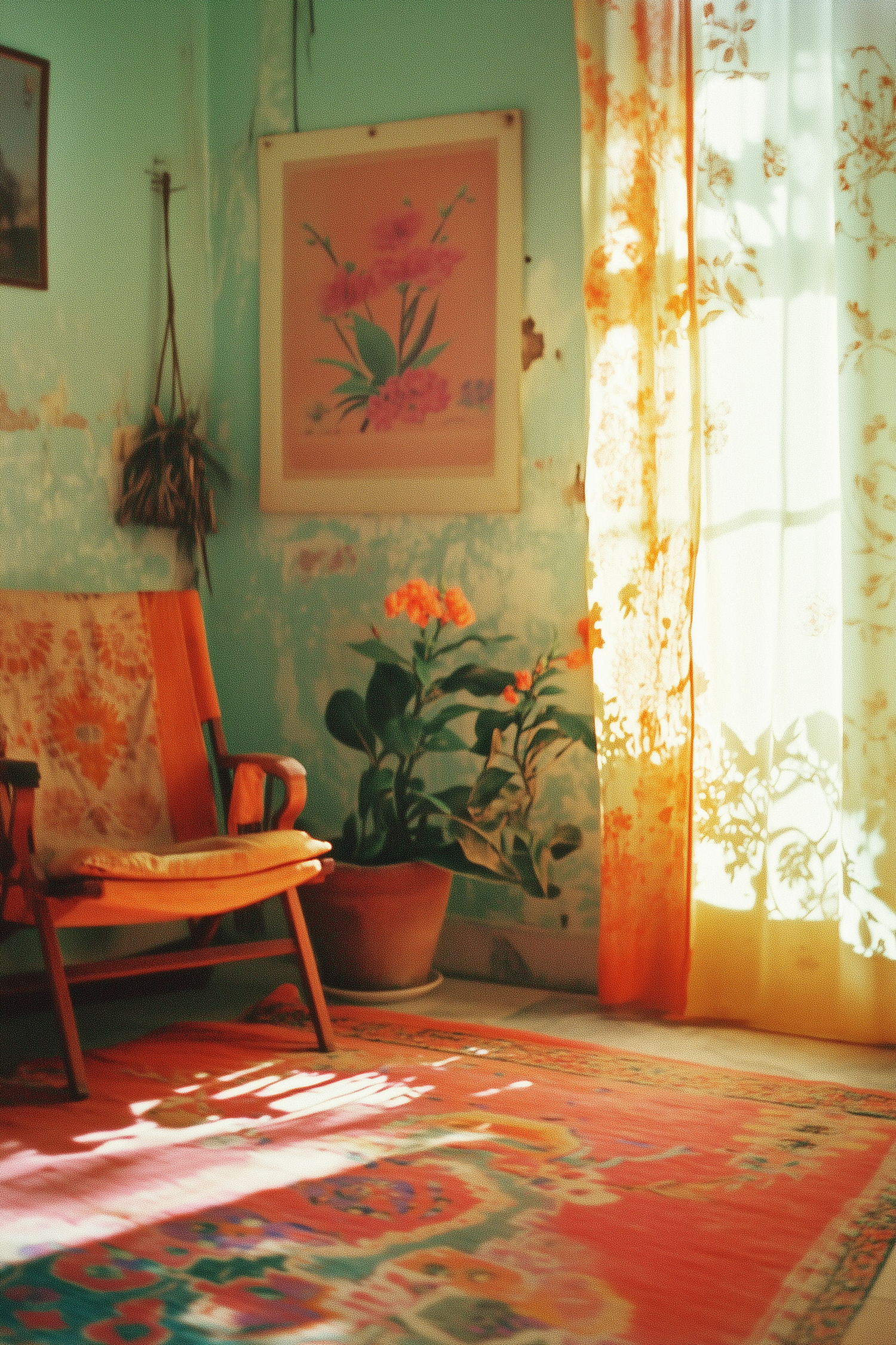 Cozy room with orange armchair, floral decor, and warm sunlight filtering through sheer curtains.