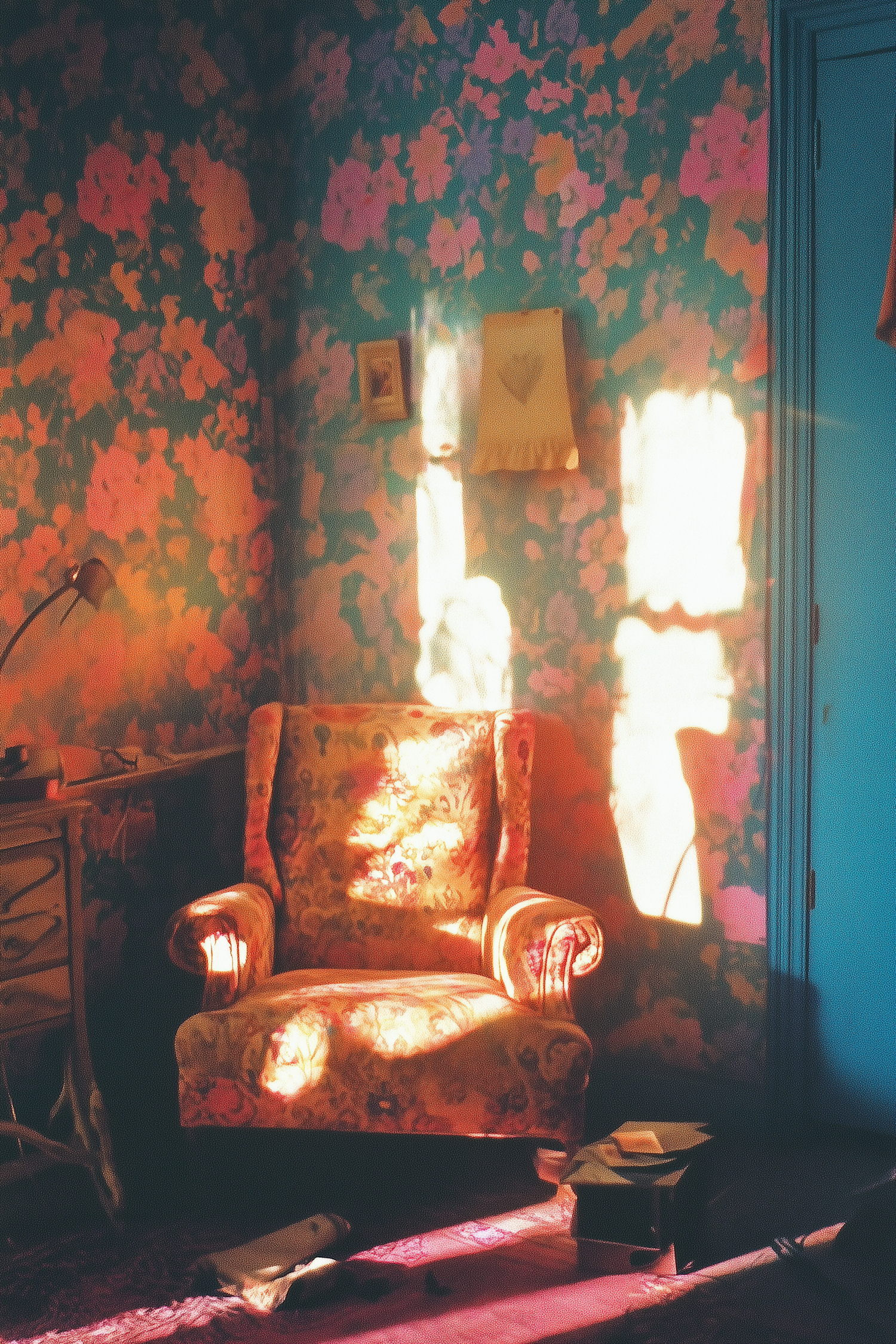 Sunlit room with floral wallpaper and armchair, vintage desk, and scattered papers. Warm, inviting atmosphere with vibrant colors.