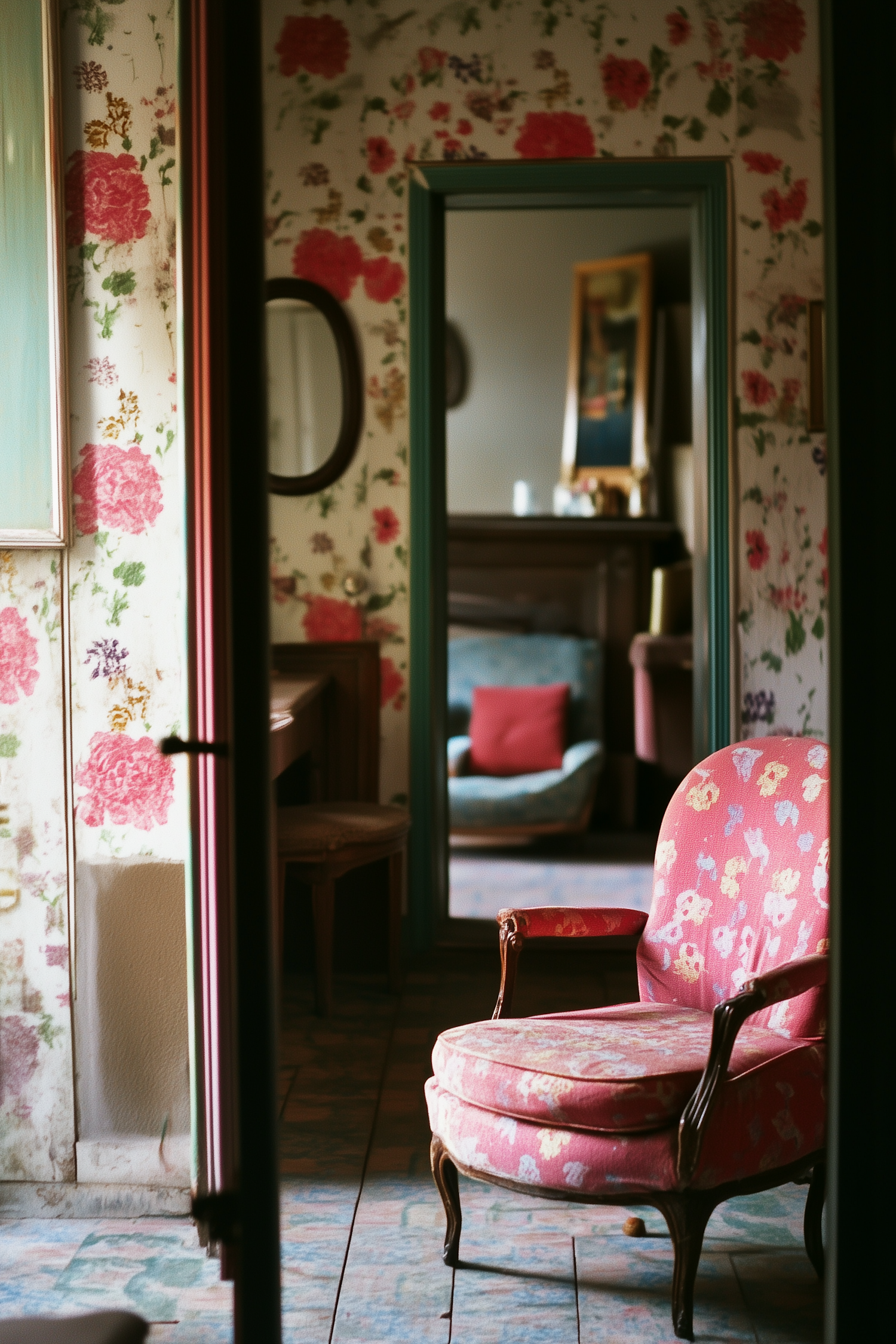 Vintage room with floral wallpaper and a pink armchair, leading to another room with a blue chair and red cushion. Cozy and elegant decor.