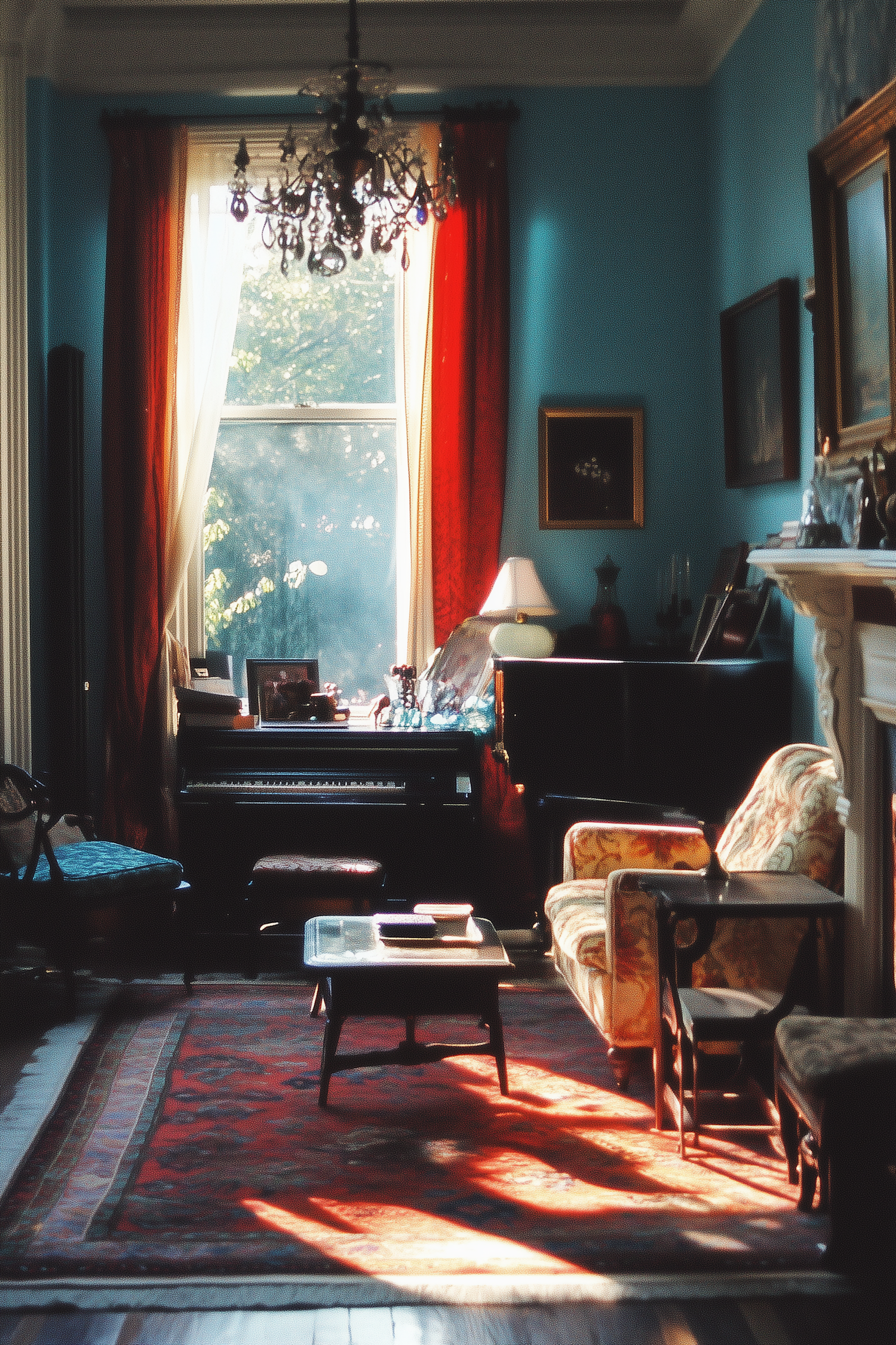 Vintage living room with piano, floral armchair, Persian rug, chandelier, and natural light through red and sheer curtains.