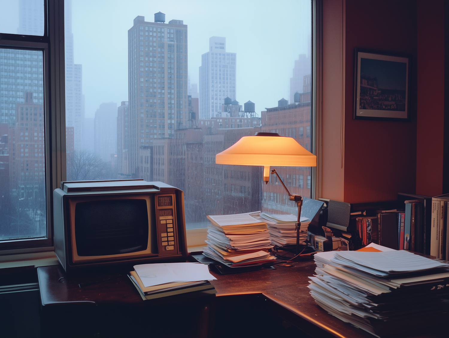 Cozy office with vintage decor, overlooking a foggy cityscape. Features a retro computer, stacks of papers, and a warm desk lamp.