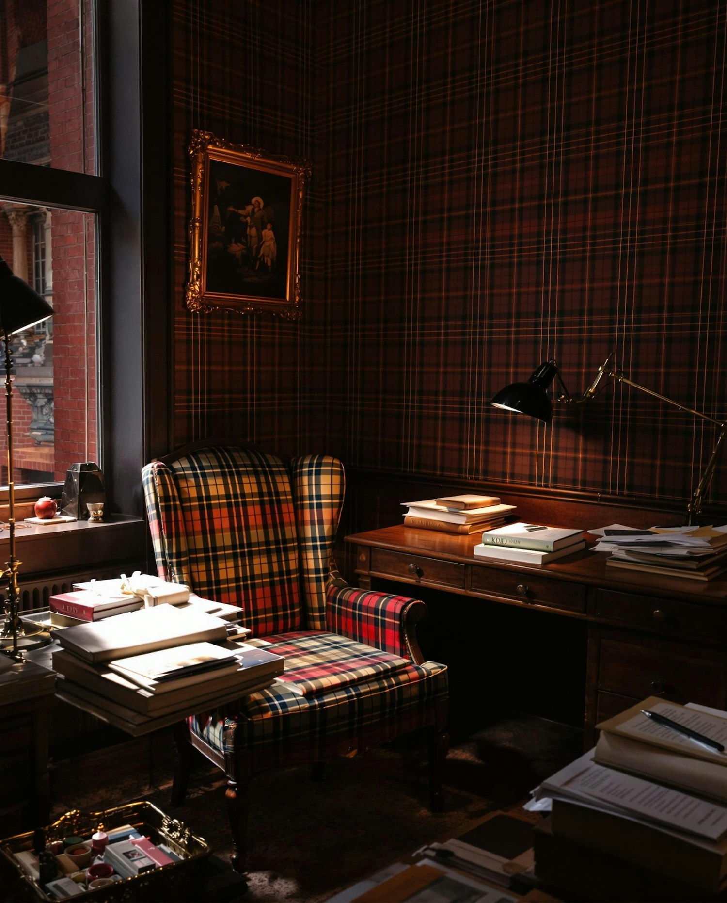 Warm study with tartan walls, matching wingback chair, wooden desk, books, and a gold-framed painting. Cozy and vintage vibes.