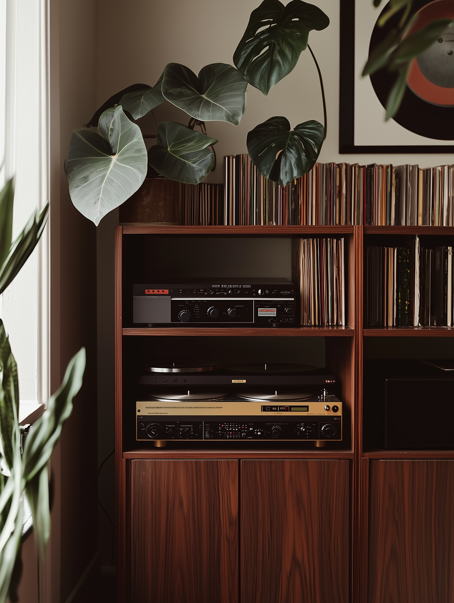 Warm wooden shelves with vinyl records, vintage audio gear, and a lush monstera plant create a cozy, retro-inspired music corner.