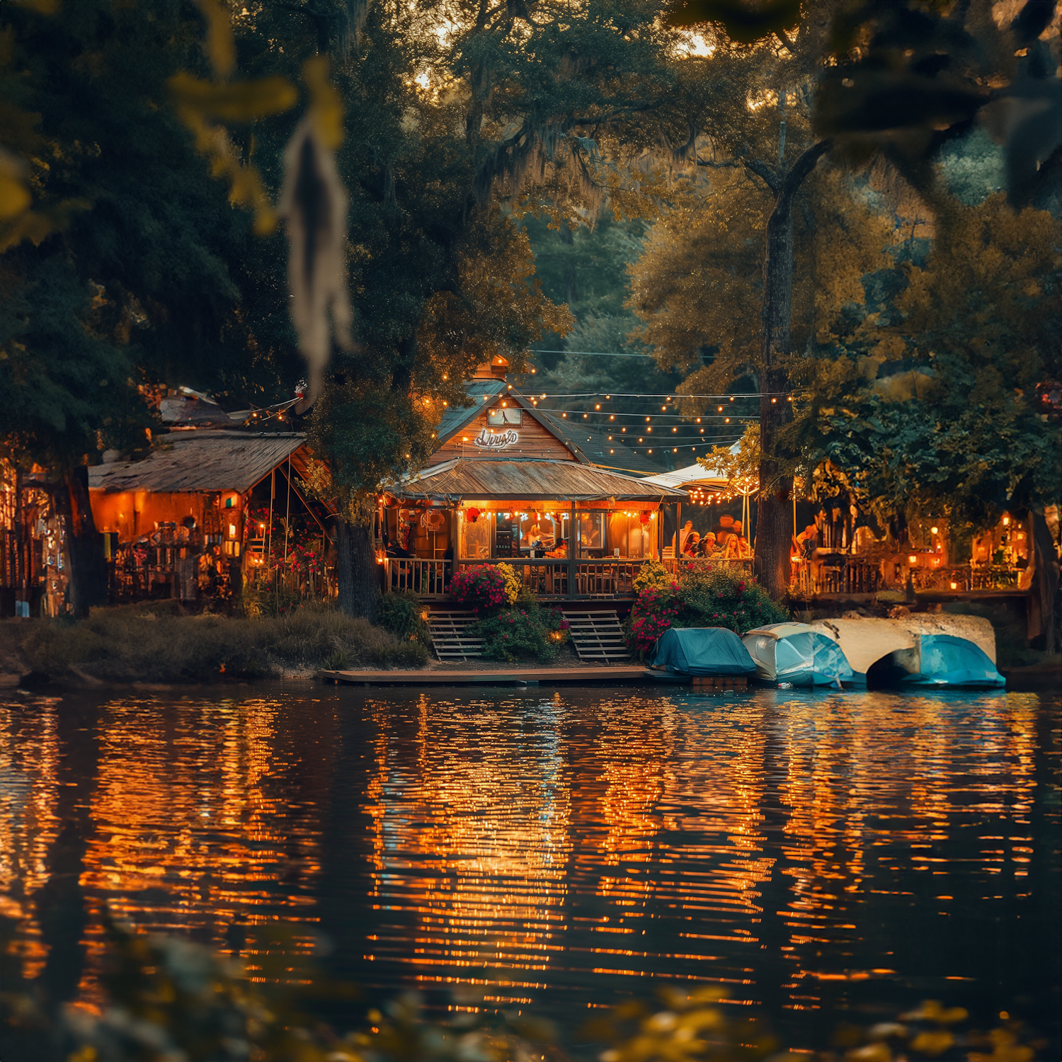 Charming lakeside cabin with glowing lights, surrounded by trees and flowers, reflecting on calm water. A serene and inviting evening scene.