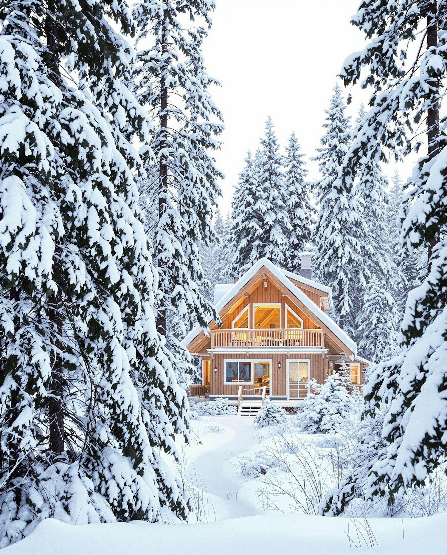 Scandinavian wooden cabin covered in snow, with warm light glowing from inside. Captured from a distance through pine trees, with soft overcast light and cozy atmosphere.