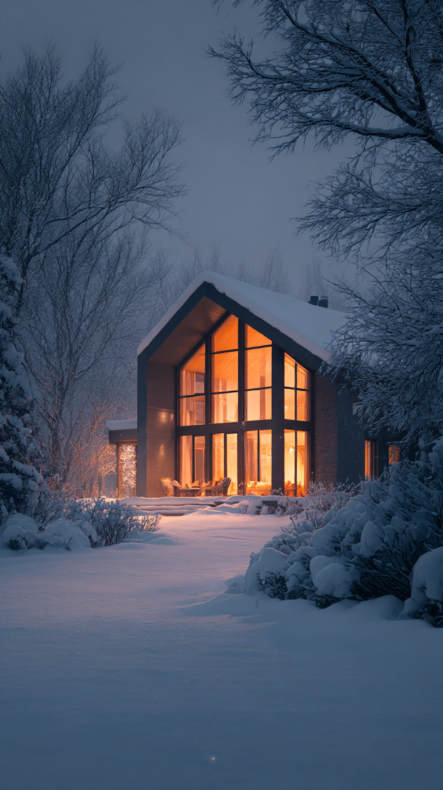 A warm-lit modern cabin surrounded by snow-covered trees, creating a serene and inviting winter scene.