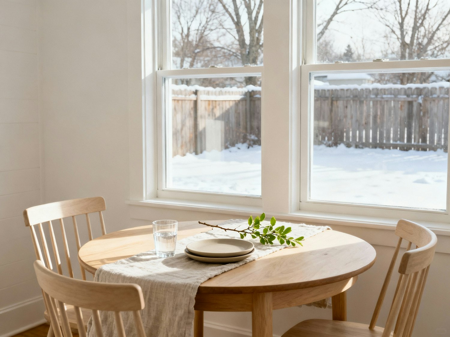 Bright breakfast/dining nook with round light-wood table placed near a tall window, outside a clear snowy yard with fence and trees; on the table a simple linen runner, two stacked neutral plates and a glass of water, small branch of greenery for winter freshness; chairs in pale wood, wall in warm off-white, overall airy and calm. 35 mm, f/4, ISO 100, 1/160 s; keep outside view slightly softened. Negative: festive table setup, candles, typography signs, heavy shadows.