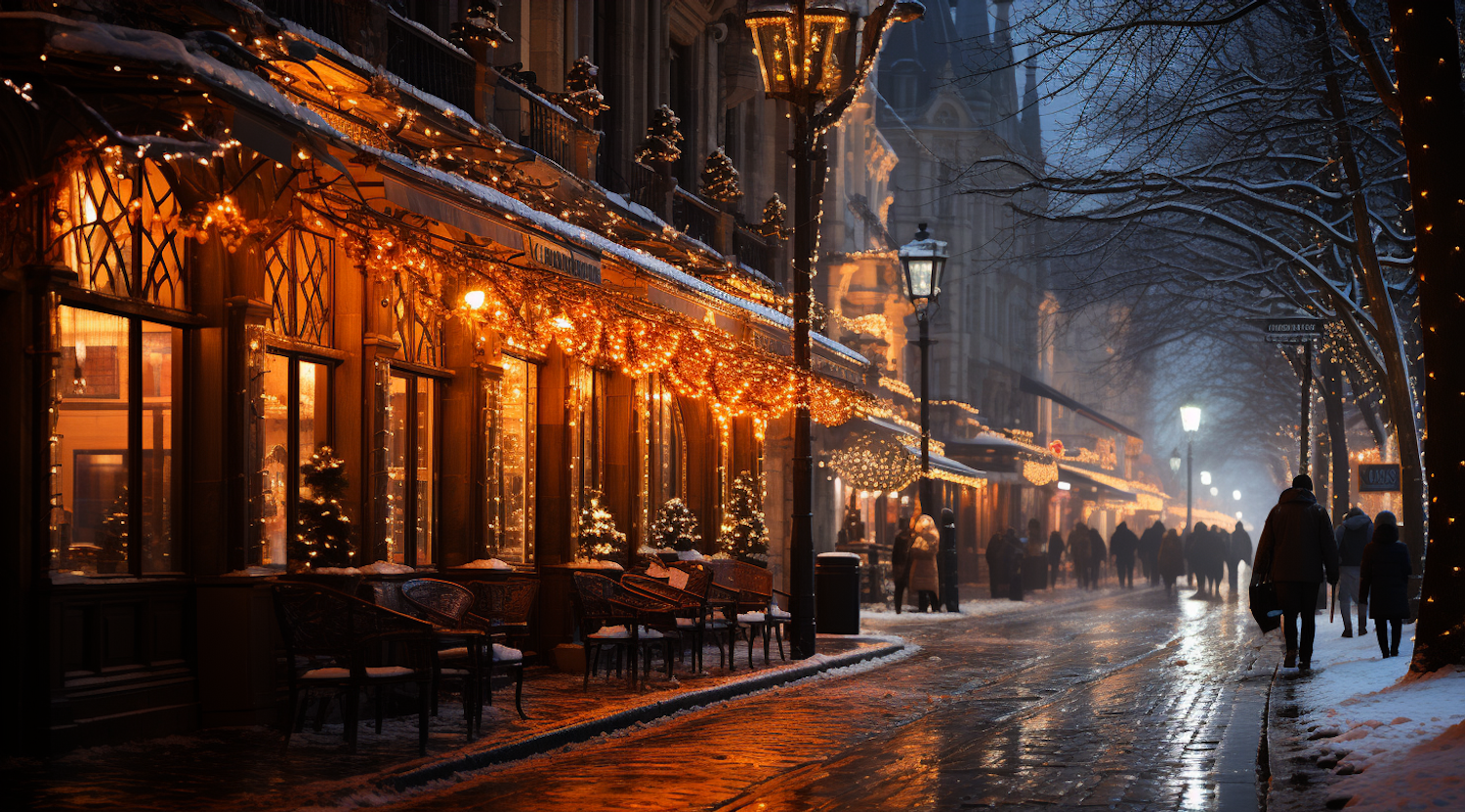 Festive winter street with warmly lit shops, snow-covered cobblestones, and twinkling lights creating a cozy, magical atmosphere.