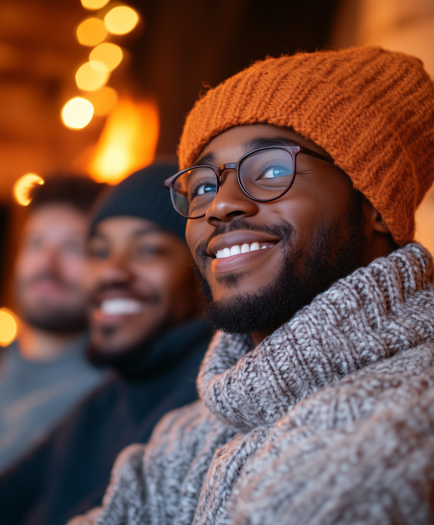 Smiling man in orange beanie and glasses, with friends in cozy setting, warm lights in background.