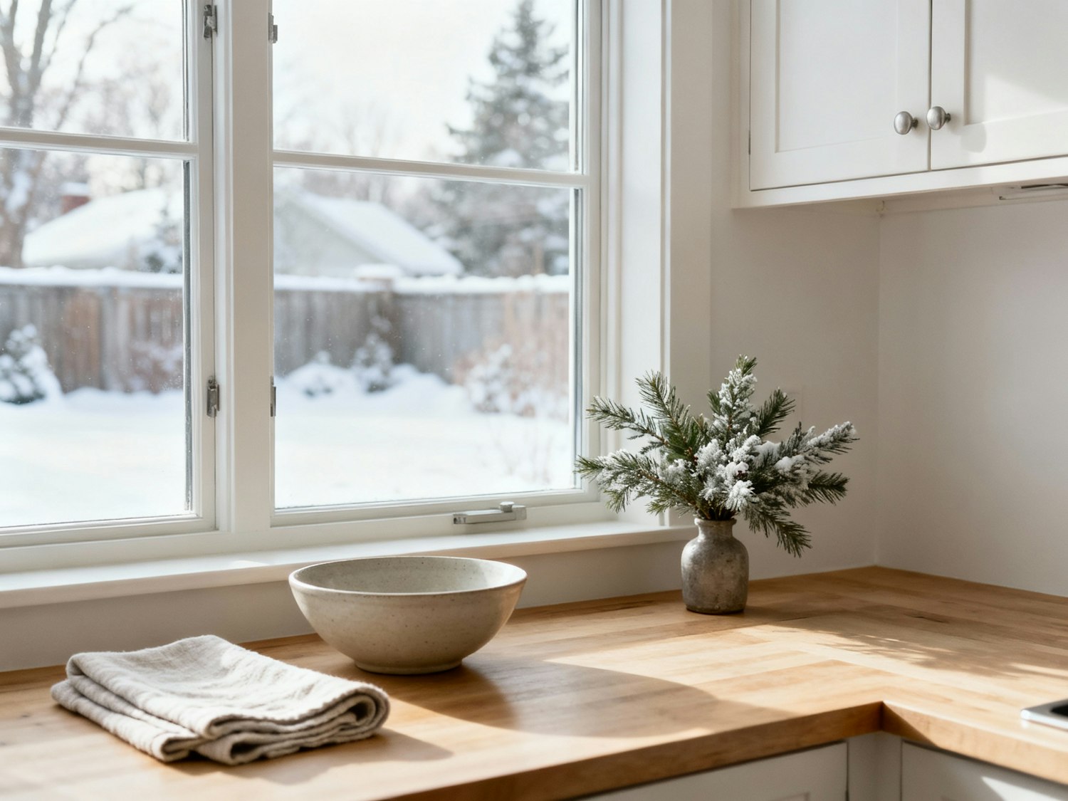 A bright kitchen corner with a wooden countertop, a vase of snowy pine branches, and a snowy backyard view through the window.