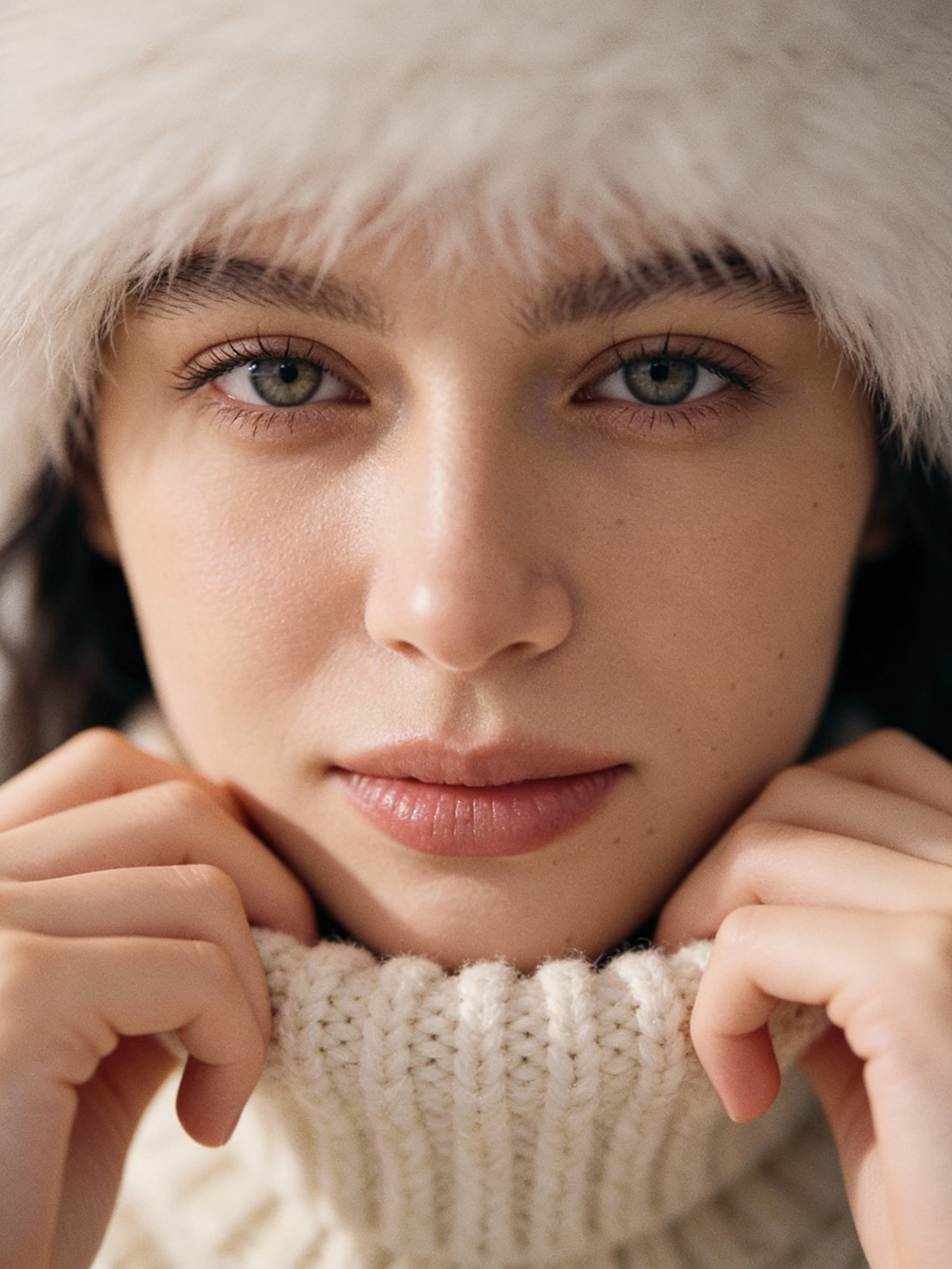 Close-up of a person in a white knit sweater and fluffy hat, showcasing soft textures and a serene expression.