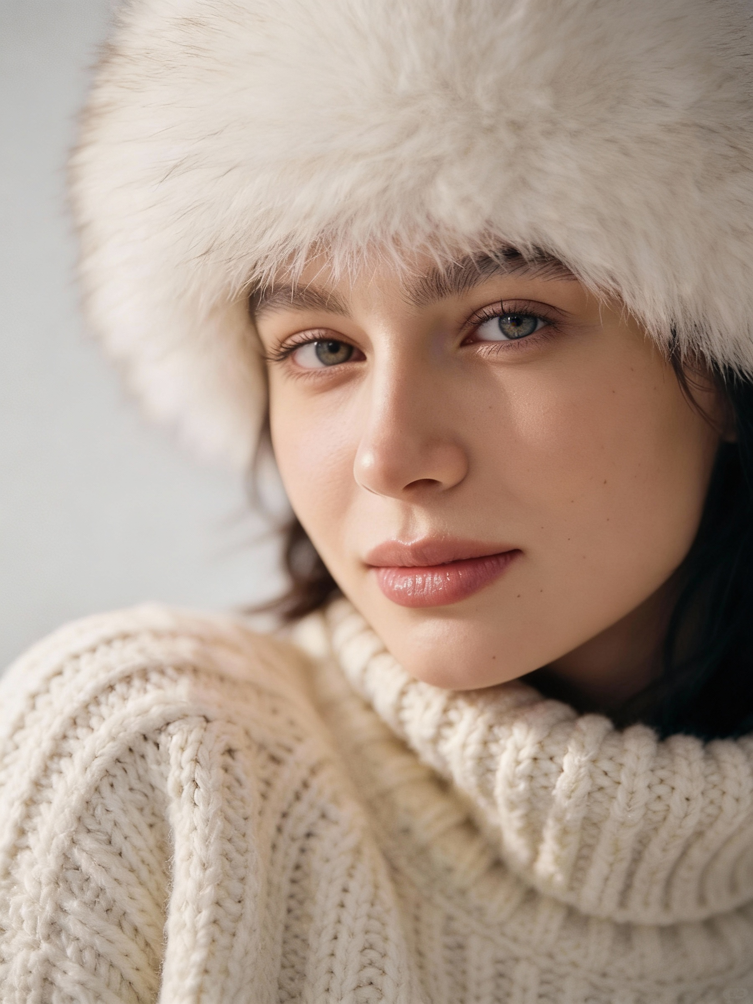 Close-up of a person in a white knit sweater and fluffy hat, showcasing soft textures and a serene expression.