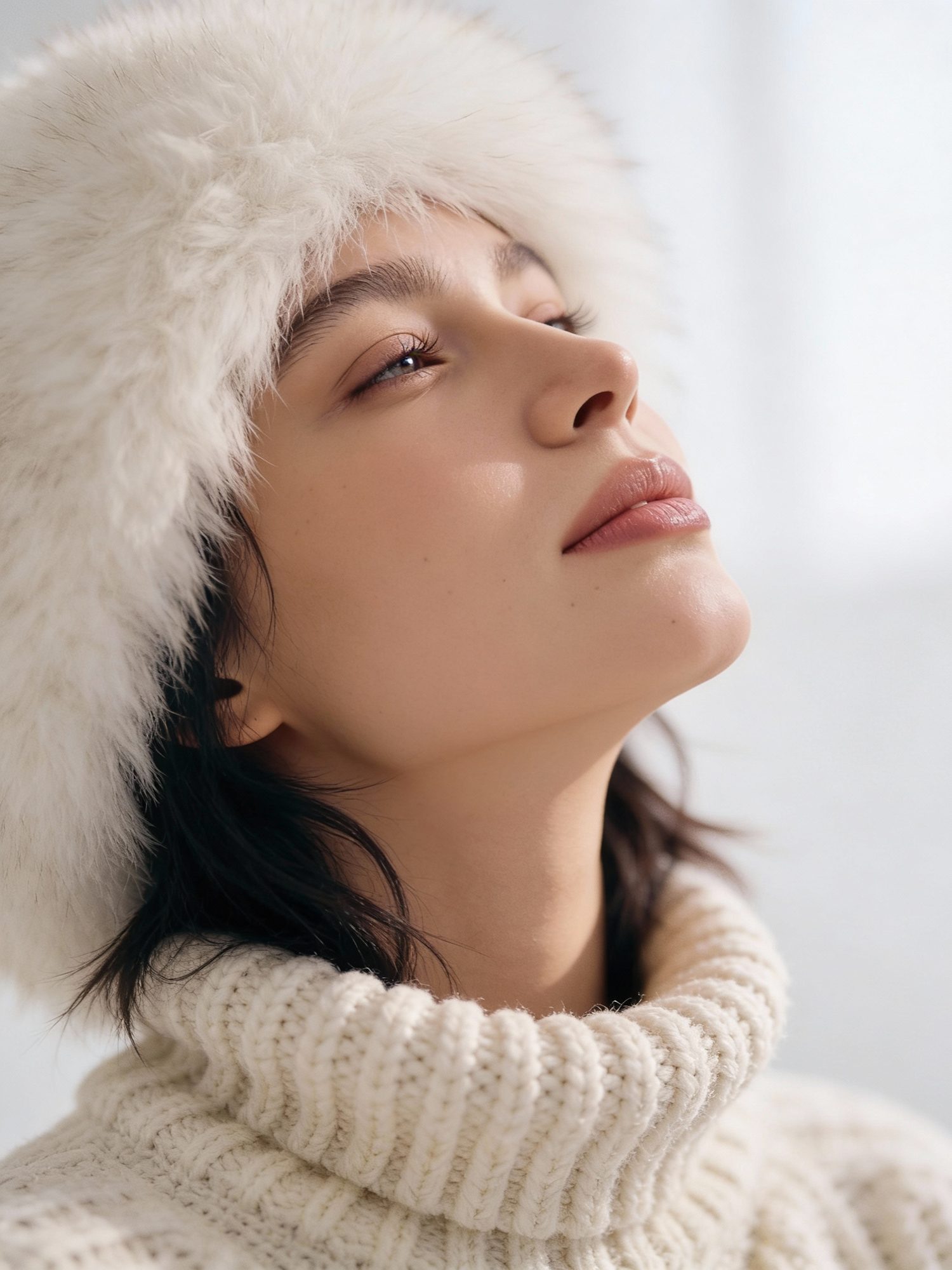 Close-up of a person in a white fluffy hat and knitted sweater, gazing upwards with a serene expression, in soft, warm lighting.