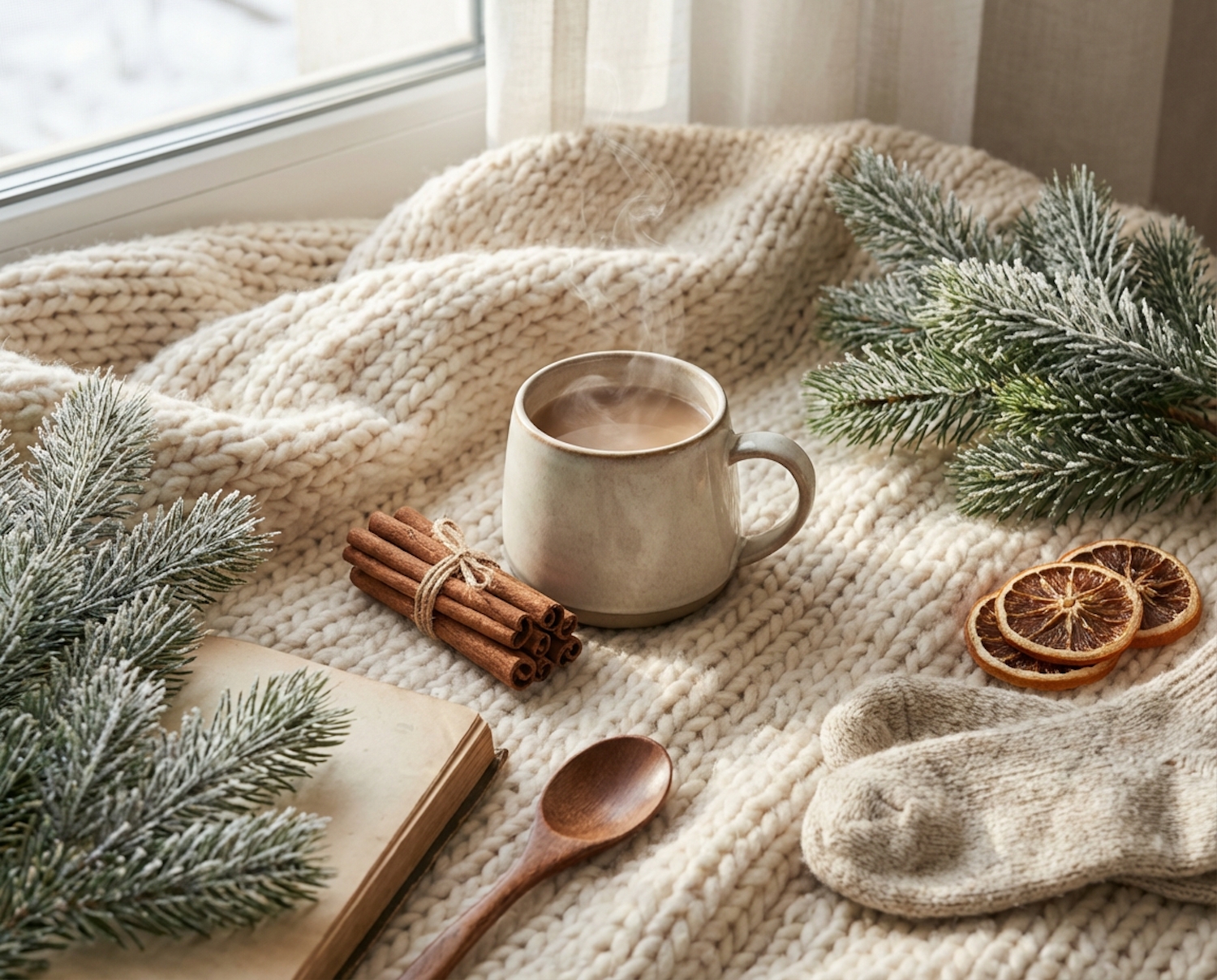 A cozy winter setup with a steaming mug, frosted pine branches, dried oranges, and a knitted blanket by a window.