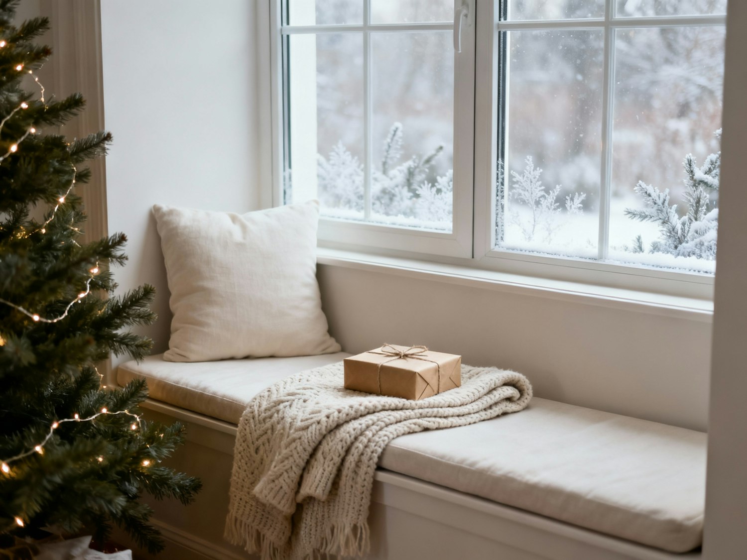 A cozy window seat with a blanket, pillow, and gift box, next to a Christmas tree, overlooking a snowy winter scene.