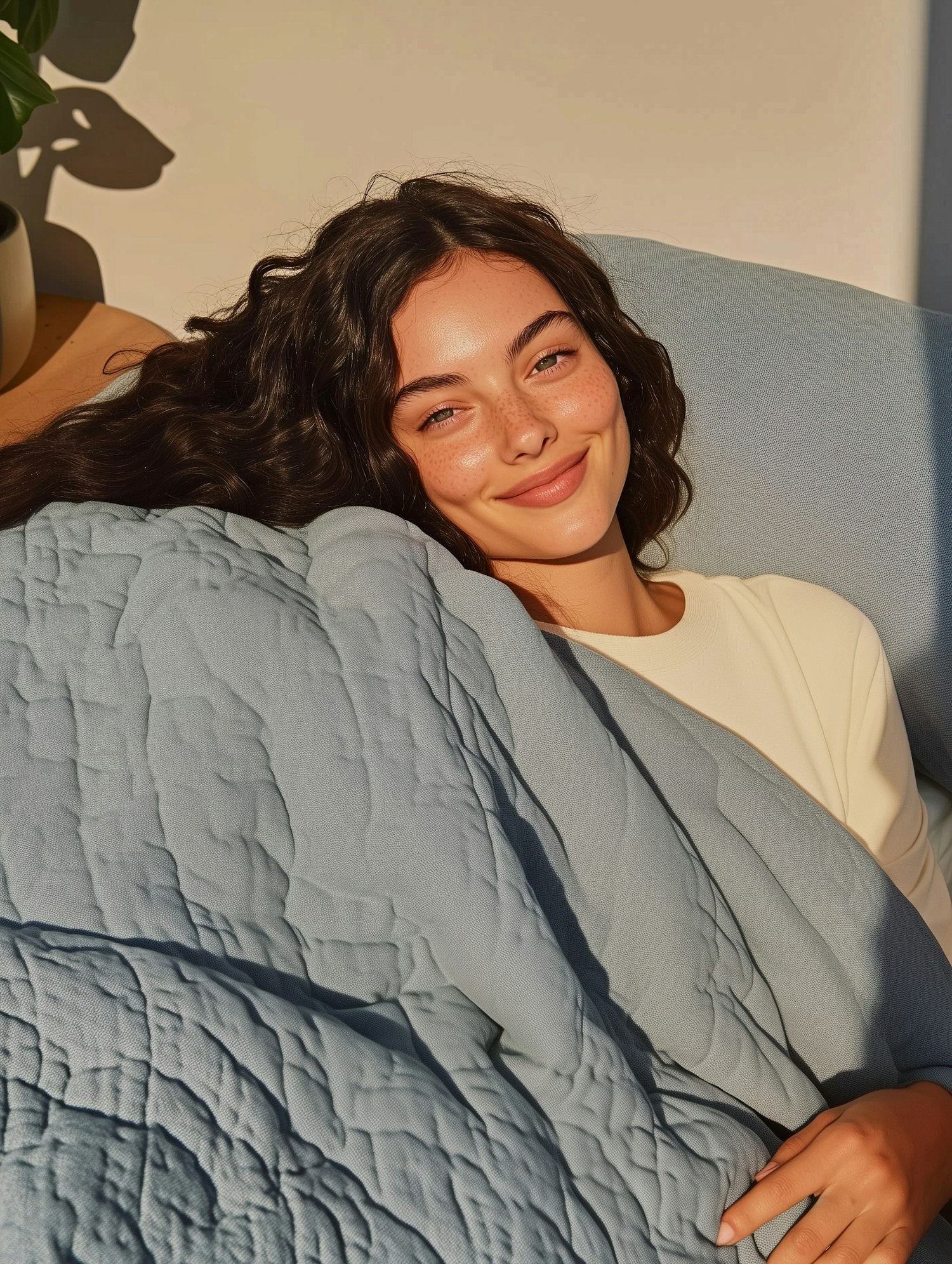 A serene moment of a young woman with freckles and wavy hair, relaxing under a light blue quilt in soft sunlight.