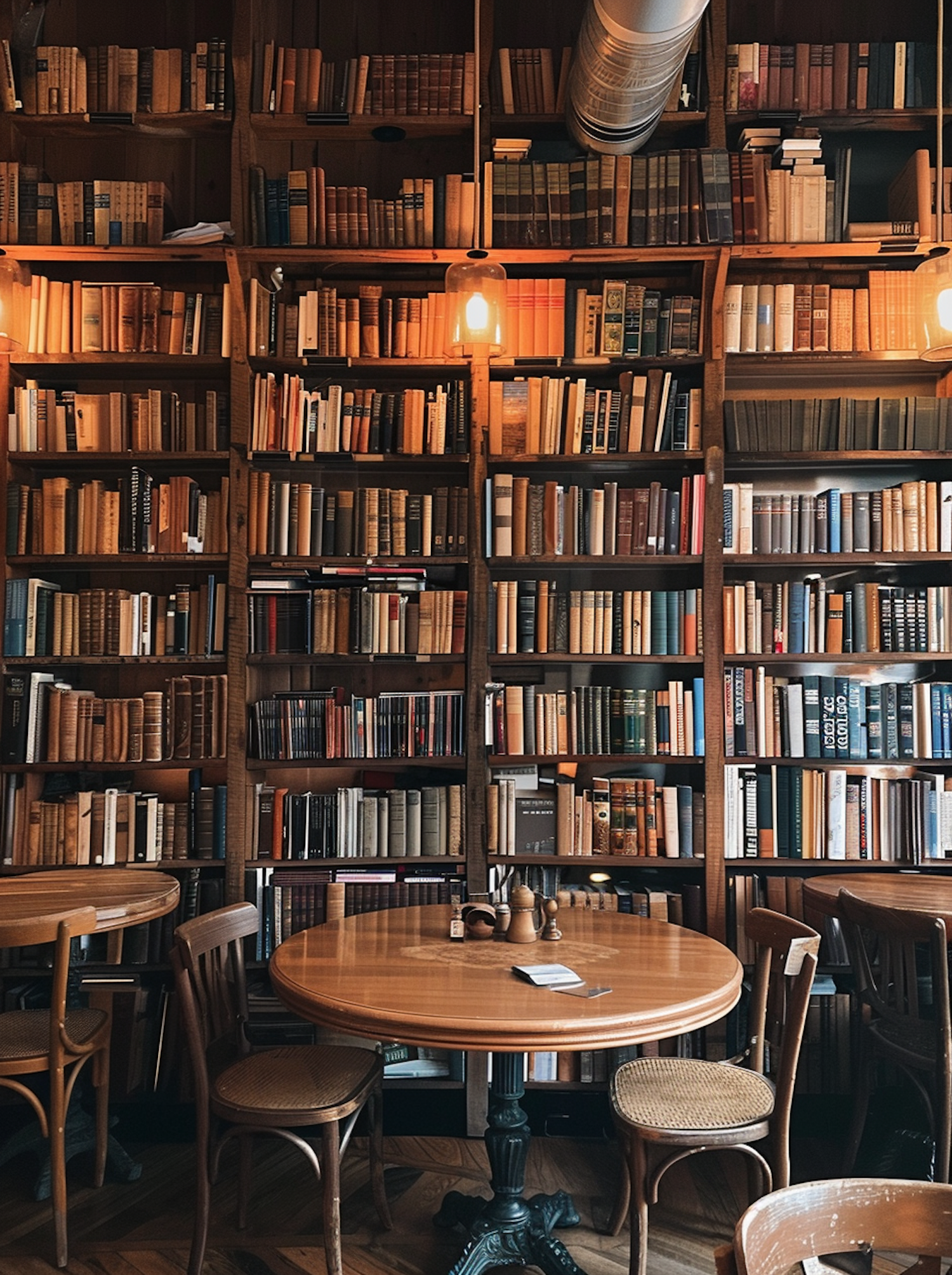 Cozy library with wooden shelves filled with books, round tables, and warm lighting, creating an inviting reading atmosphere.