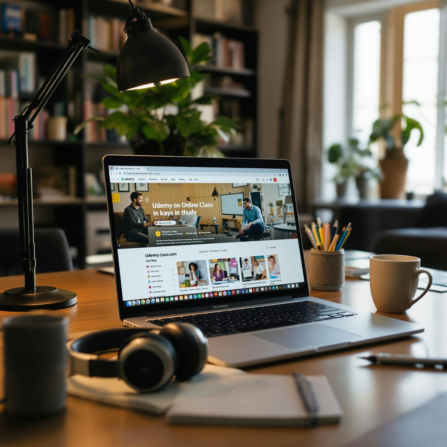 A laptop on a desk showing an online learning platform, surrounded by a lamp, headphones, and a coffee mug in a cozy workspace.