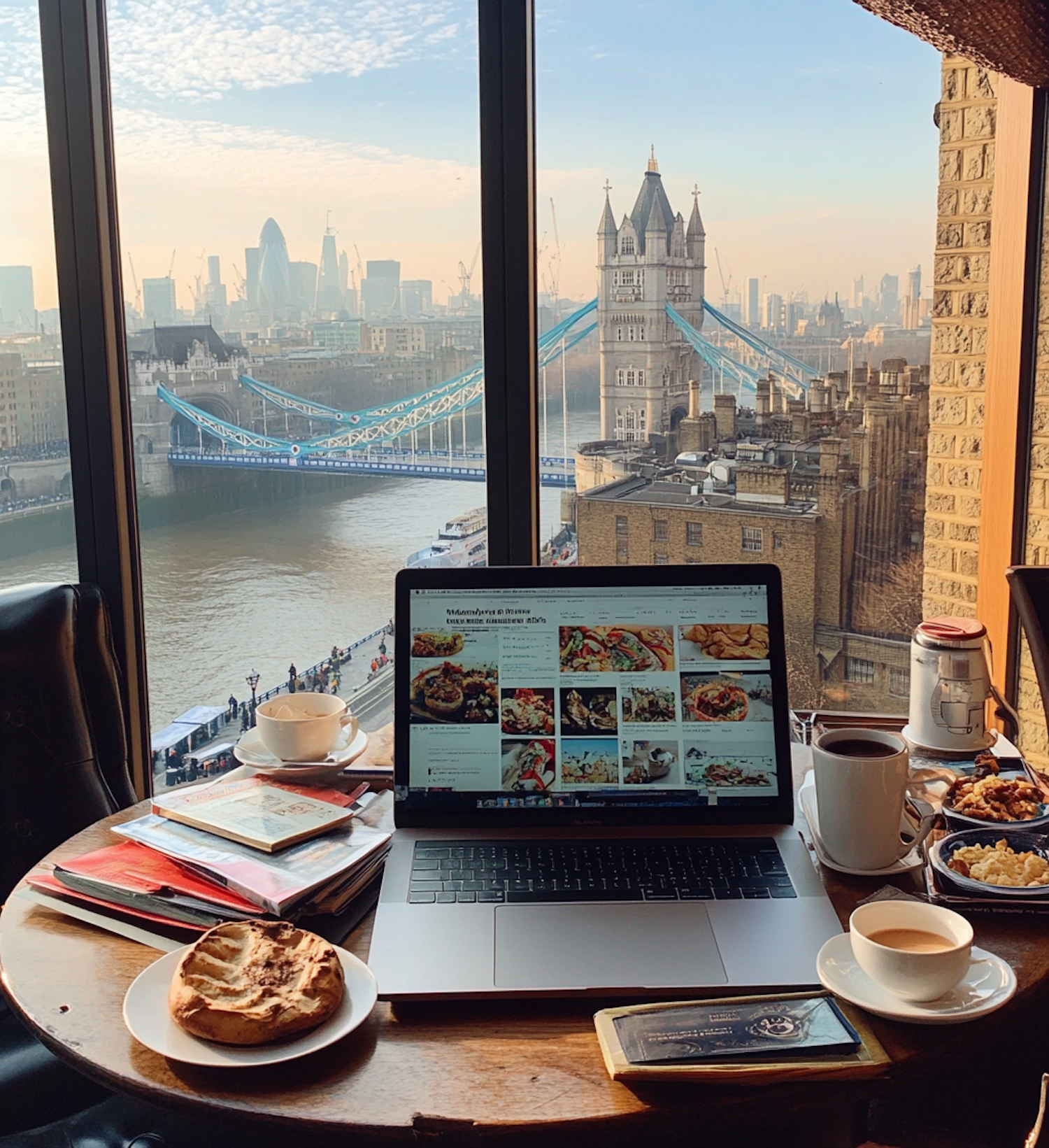 A cozy workspace with a laptop and coffee, overlooking London's Tower Bridge and the Thames, blending productivity with a stunning view.