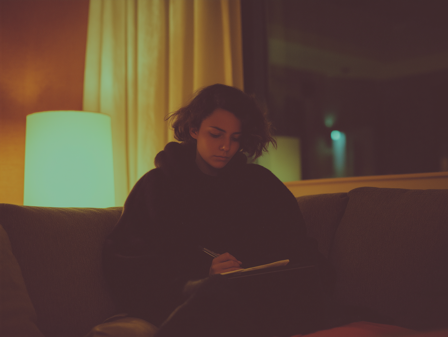 A person writing in a notebook on a couch, illuminated by a warm lamp in a cozy, dimly lit room with curtains and a window in the background.