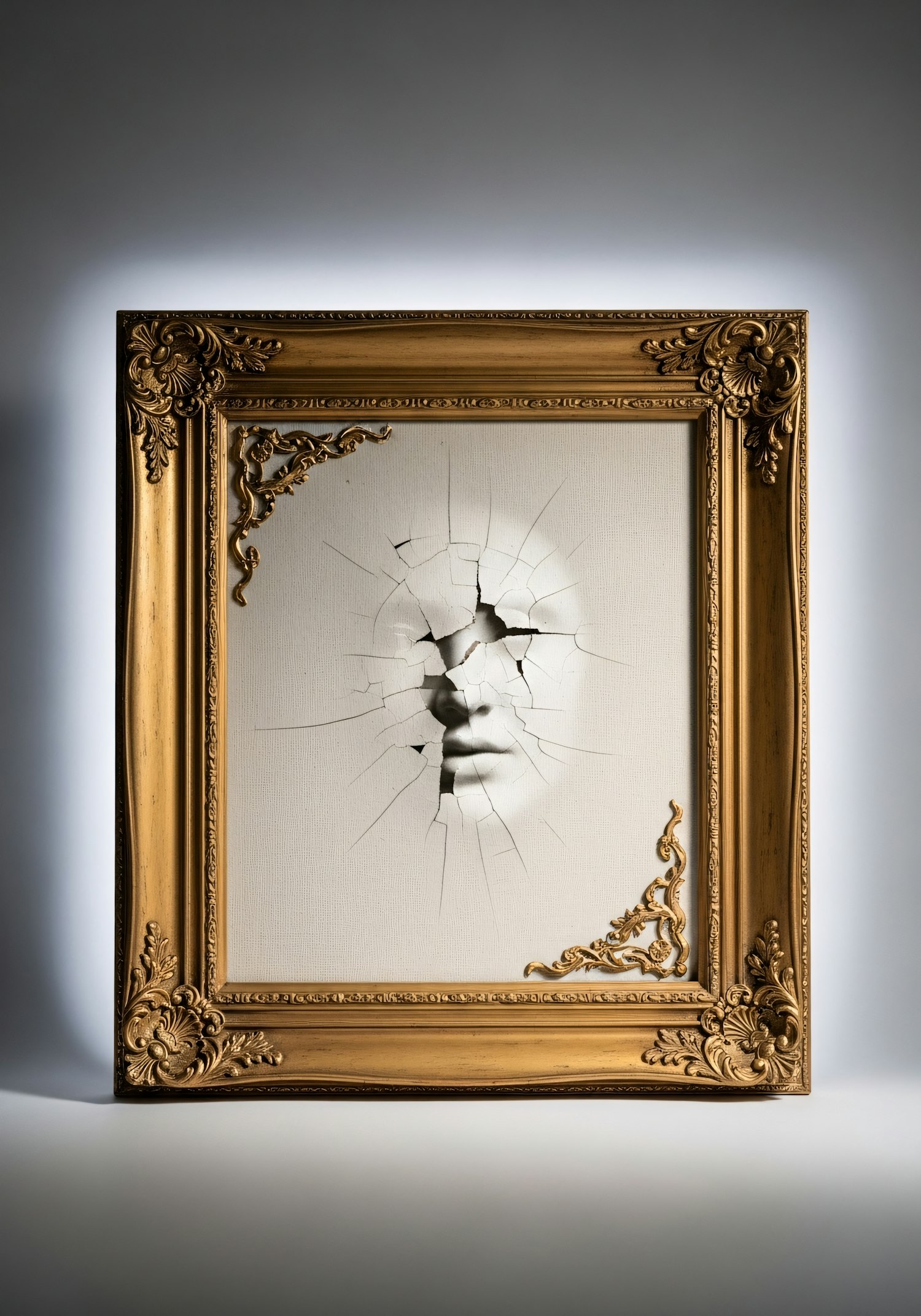 A golden ornate frame surrounds a cracked canvas forming a human face, blending classic and surreal elements in a striking visual.