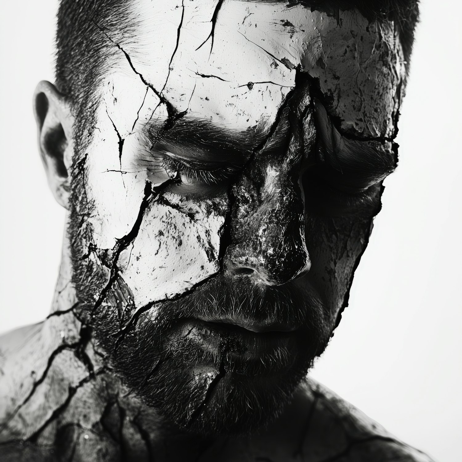 Close-up of a man's face with cracked mud texture, closed eyes, and a contemplative expression in a monochromatic style.