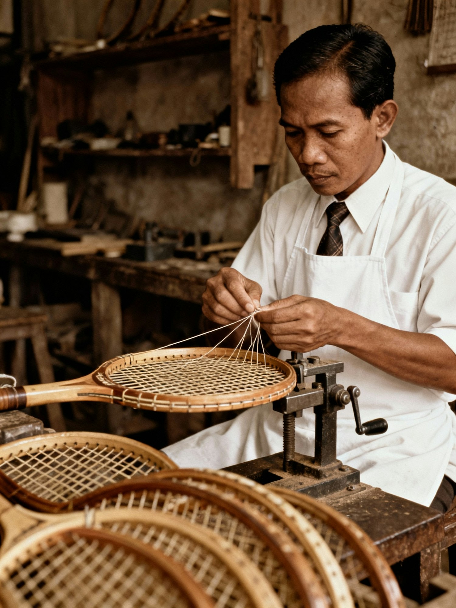 A craftsman strings a wooden tennis racket in a workshop, showcasing traditional skills and dedication in a warm, detailed setting.