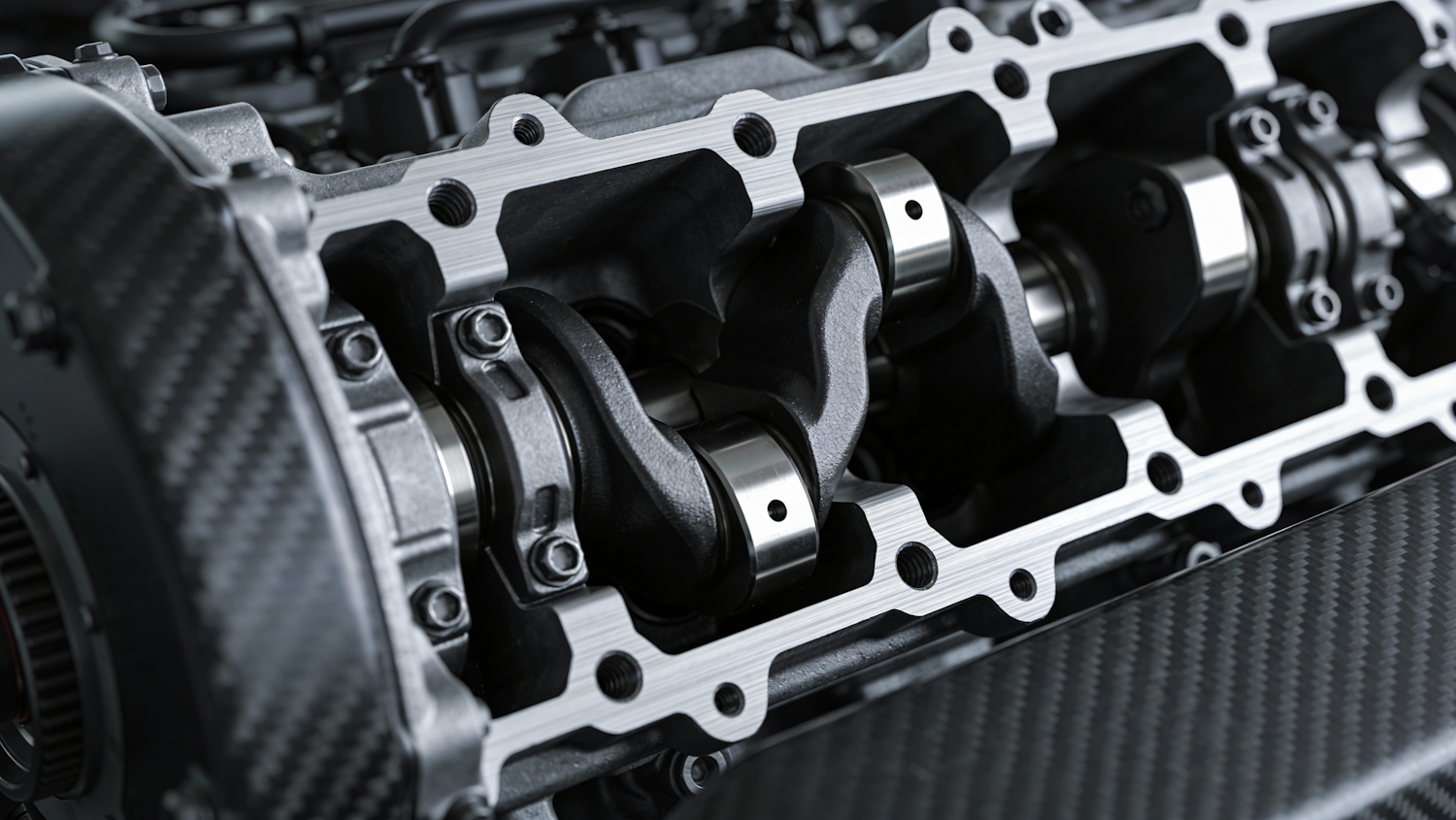 Close view of a futuristic supercar engine block with sculpted metal casing, subtle motion blur suggesting vibration and power, brushed steel and carbon fiber textures sharply defined, deep industrial shadows, dark grey monochrome palette, graphite and steel tones
