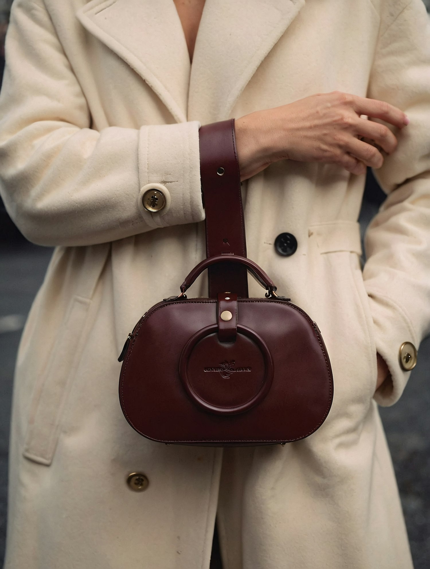 Stylish cream wool coat paired with a chic dark brown leather handbag featuring a circular design and embossed logo.