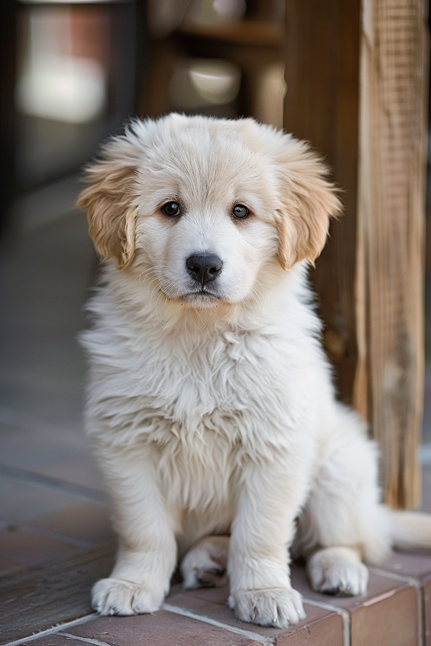Adorable fluffy white puppy with light brown ears sitting on a tiled floor, exuding cuteness and curiosity.