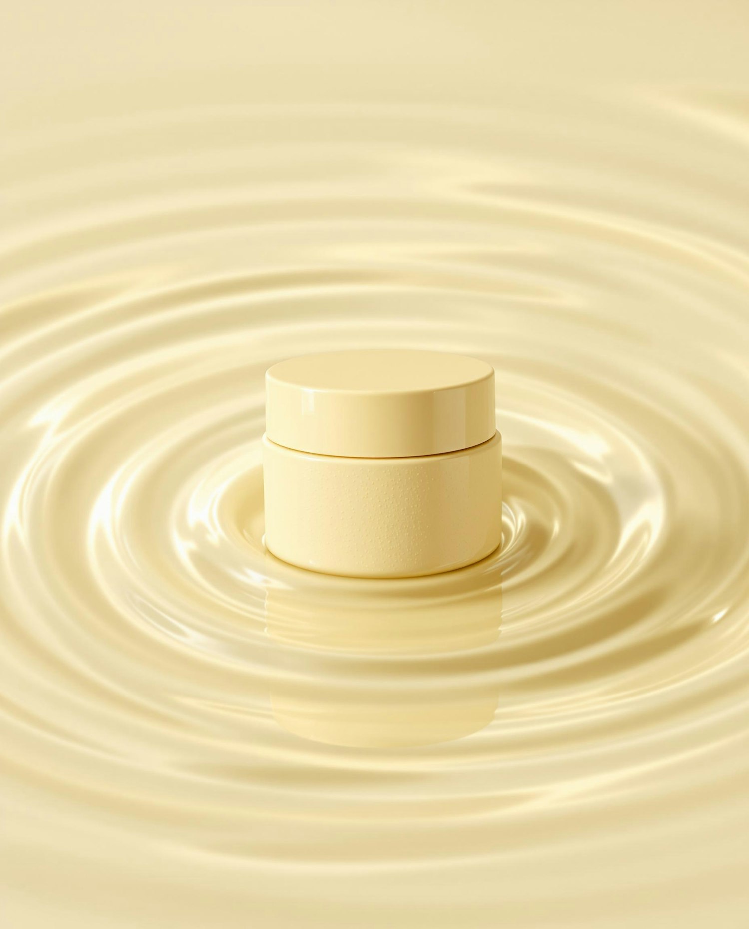 Studio photography, skincare packaging floating on a textured liquid surface, soft natural lighting, subtle reflections, pastel color grading, light embossed texture on bottles, calm and artistic atmosphere, one wide, matte ceramic jar in butter yellow seen from above, centered with soft shadows and light reflecting off the surface