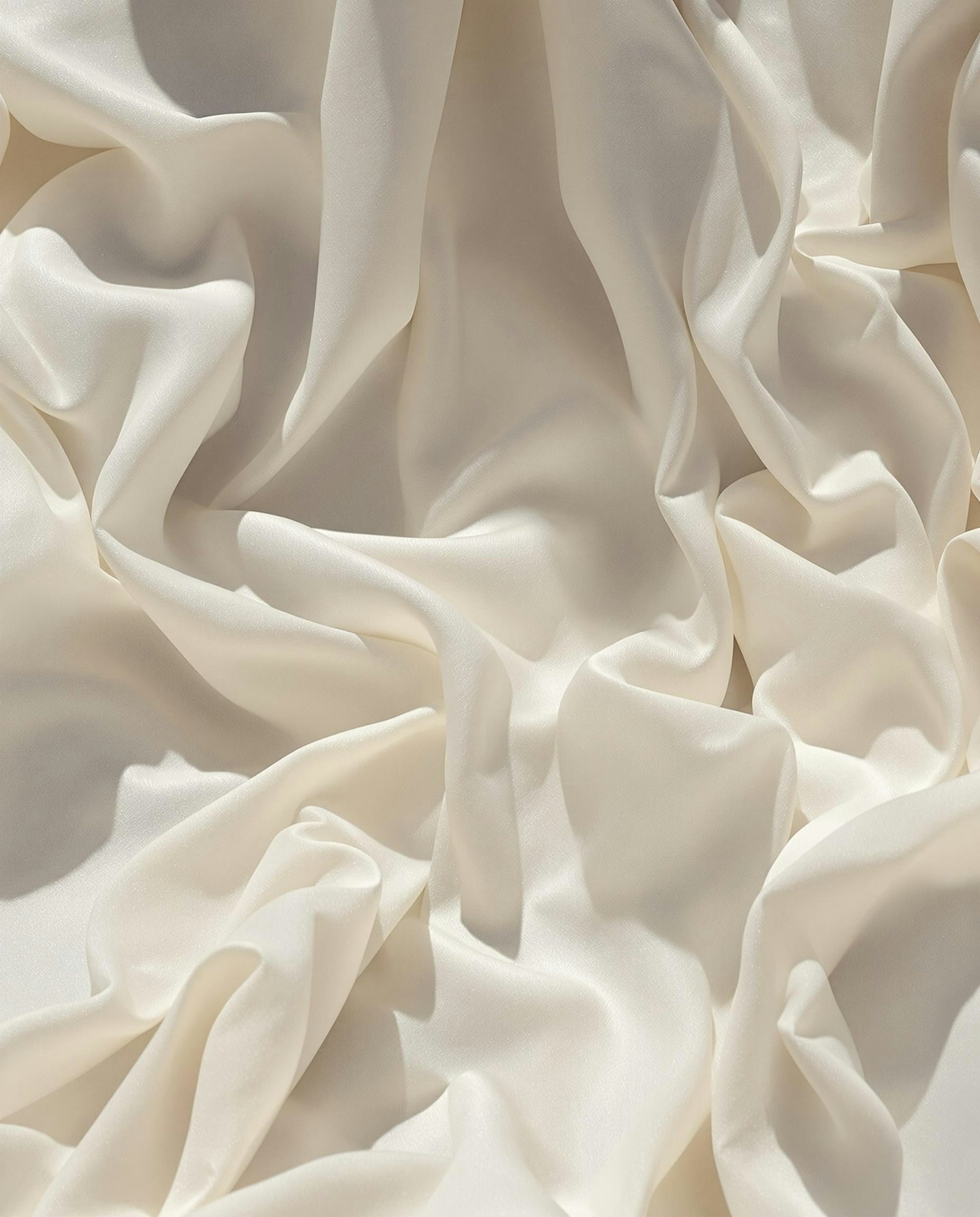 Luxurious cream-colored fabric with a silky texture, arranged in soft folds, creating a dynamic play of light and shadow.