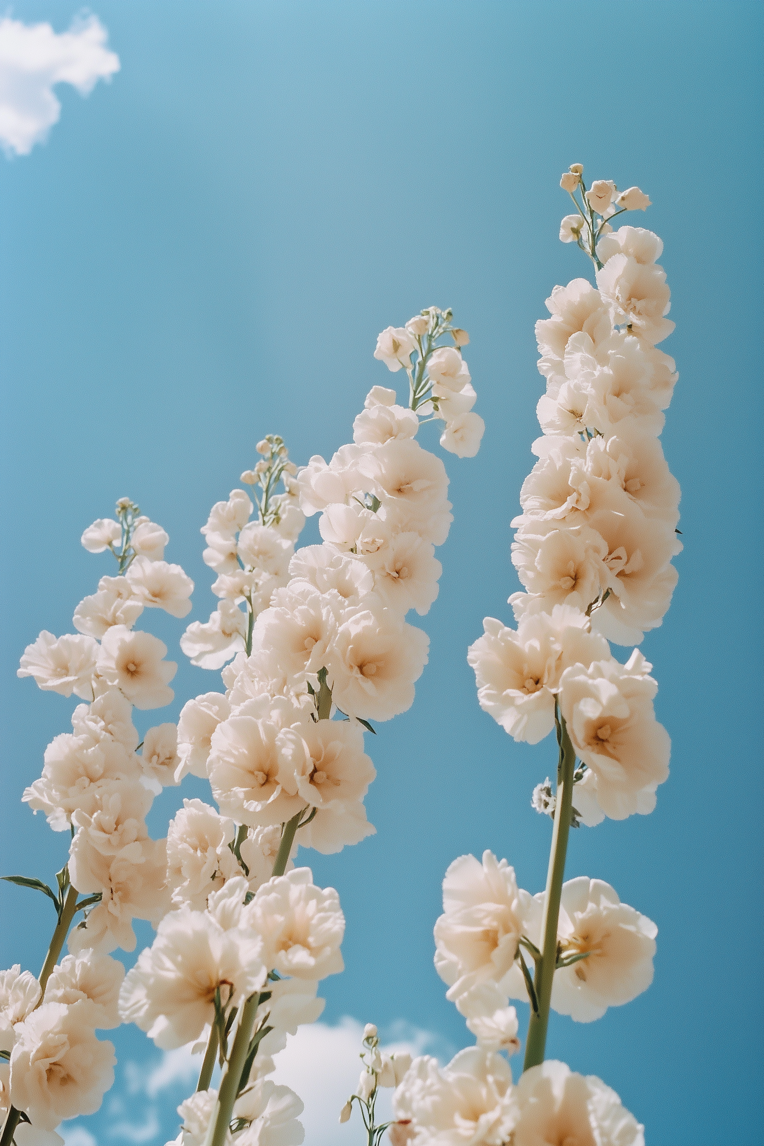 Cream-colored flowers on tall stems against a bright blue sky with scattered clouds, creating a serene and uplifting scene.