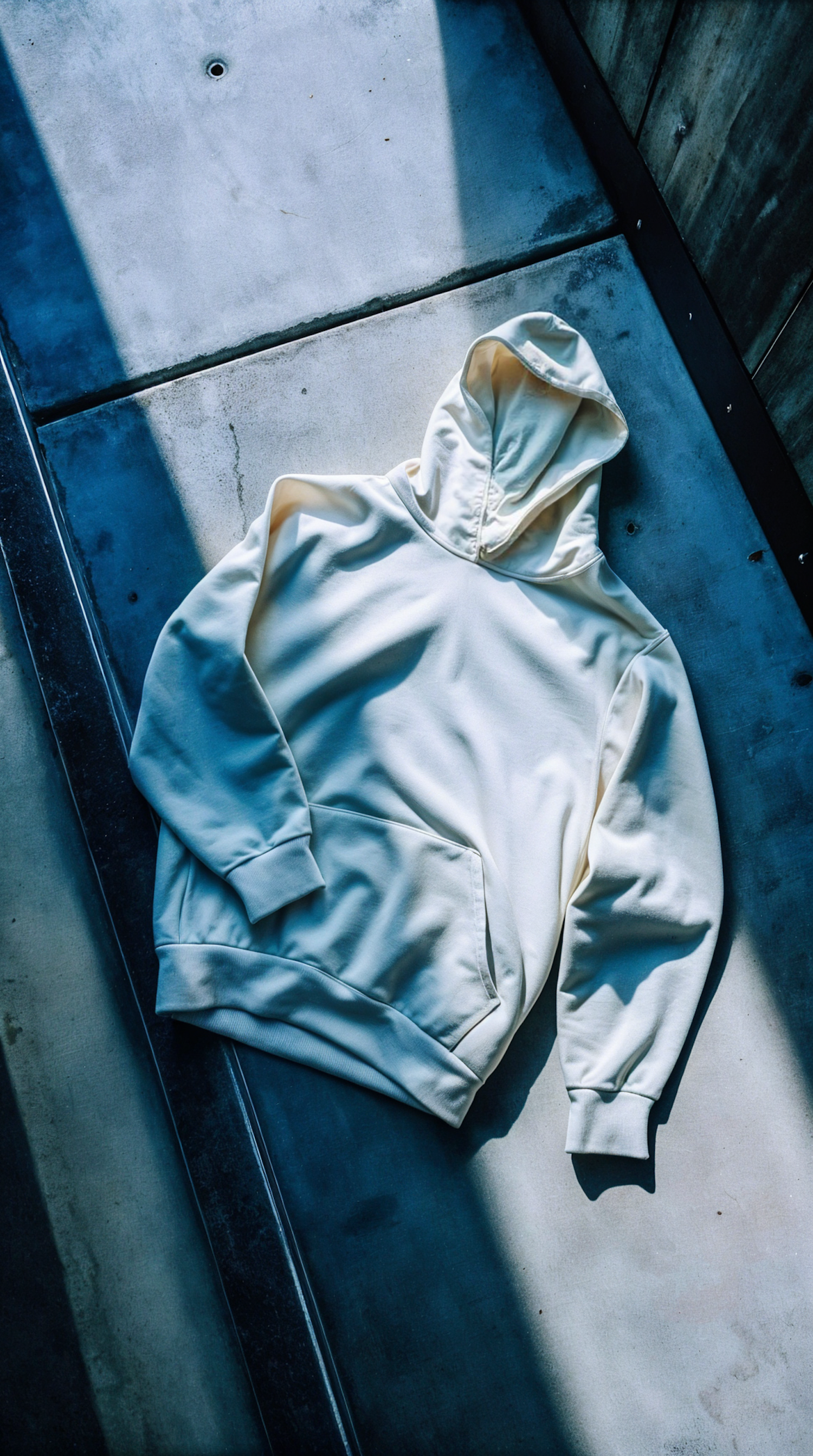 Cream-colored hoodie on a concrete surface with dynamic lighting and shadows, creating a casual and industrial aesthetic.