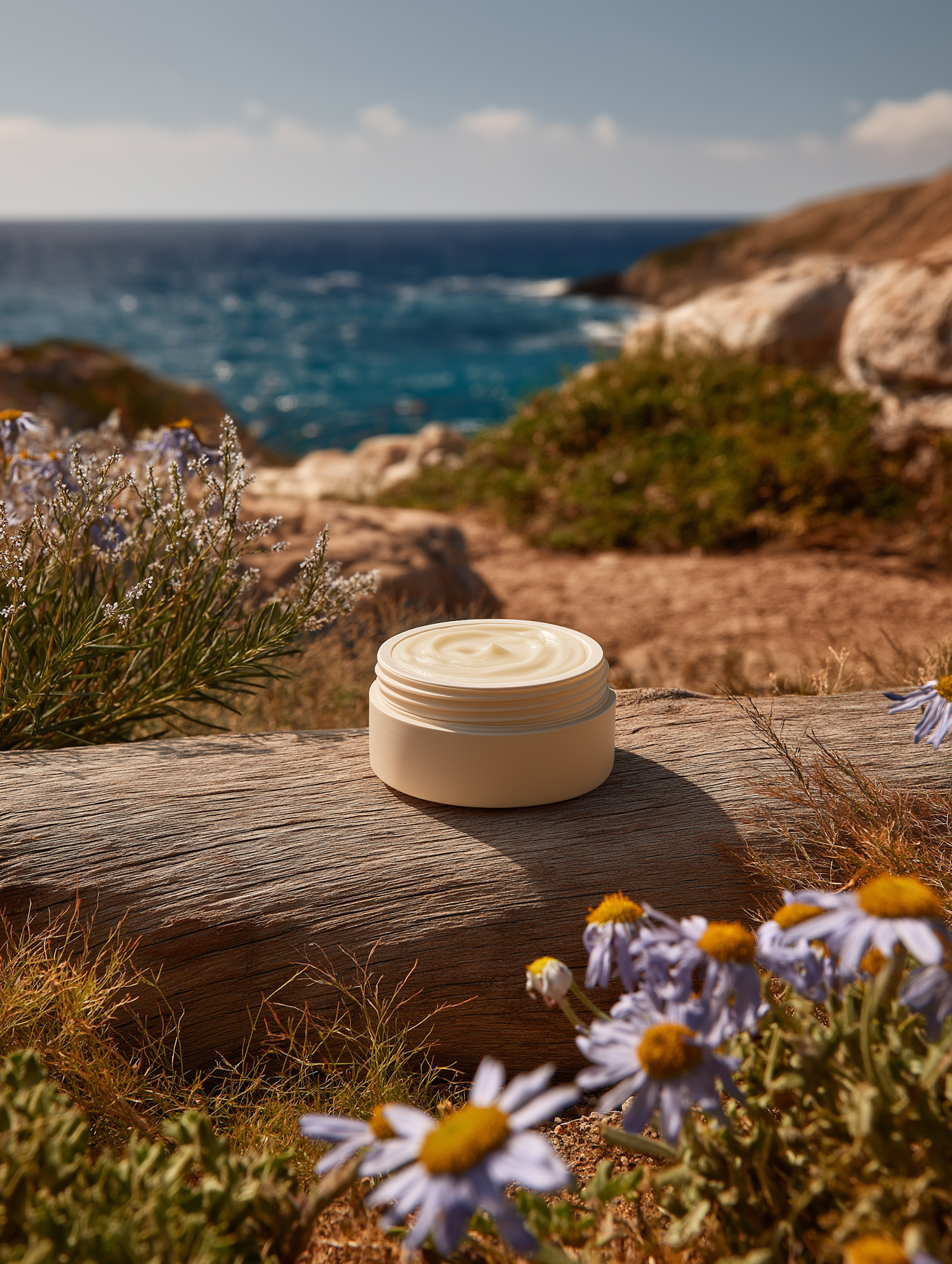 A jar of cream on a wooden surface with wildflowers and a coastal ocean view in the background.