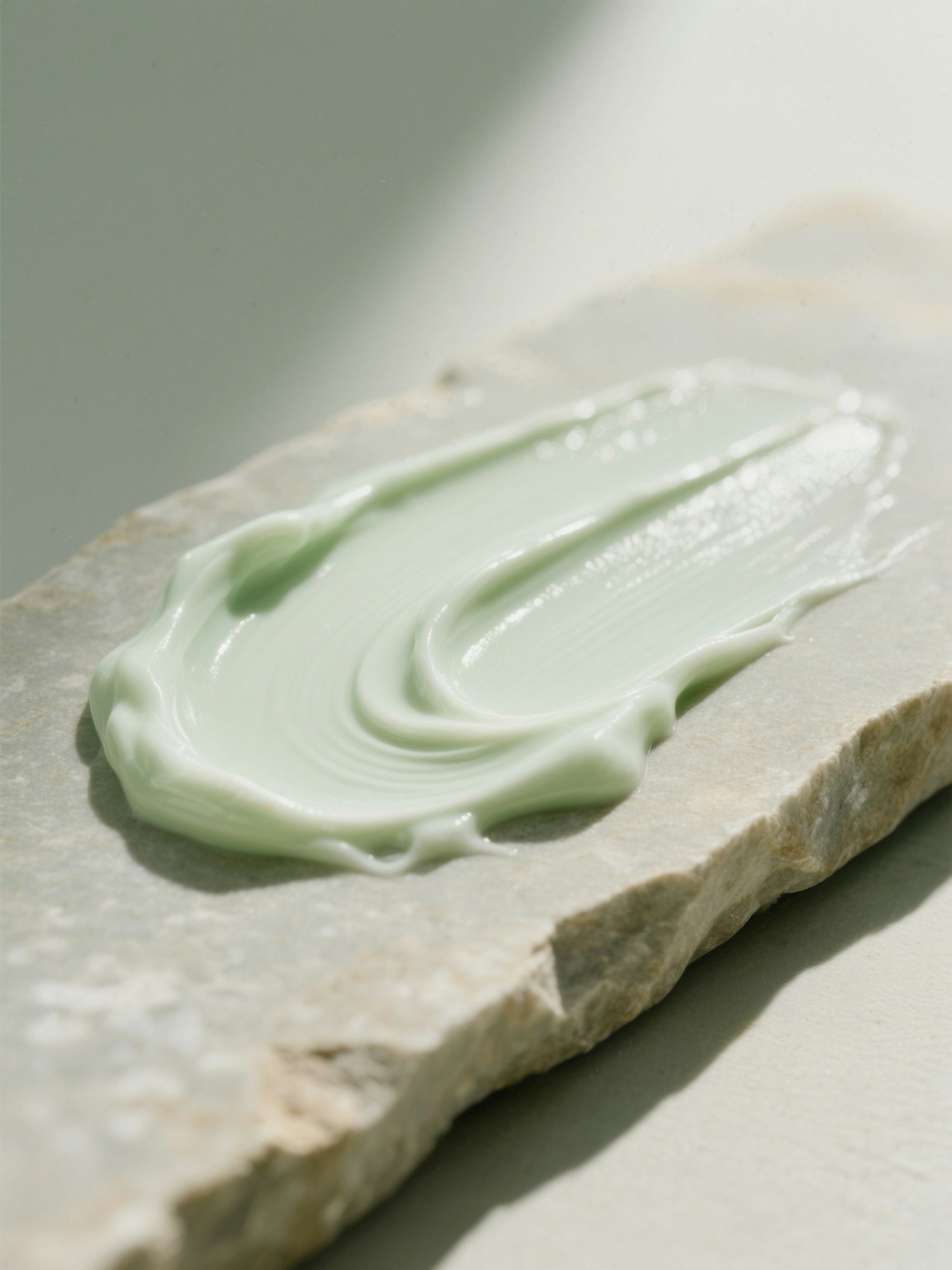 Light green cream elegantly spread on a textured stone surface, showcasing its smooth texture and natural aesthetic in soft lighting.