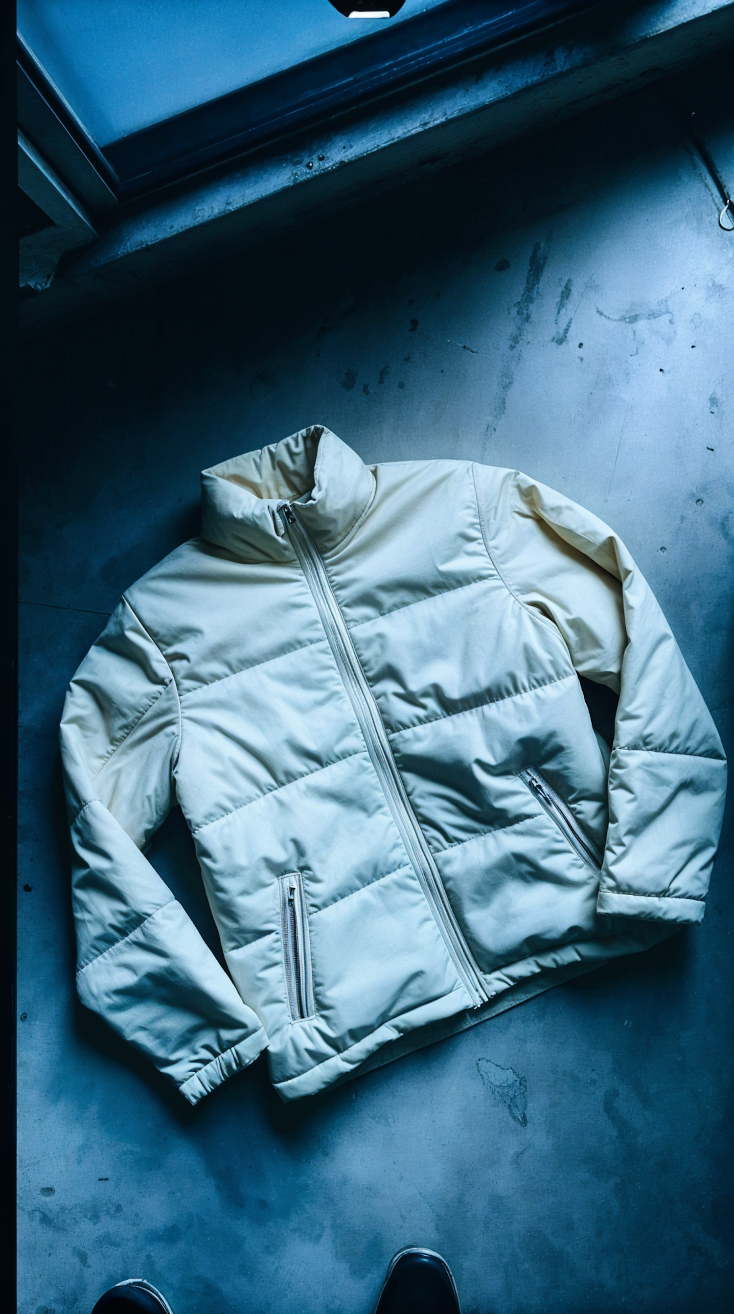 Cream puffer jacket with high collar and zippered pockets on a concrete floor, cool blue lighting adds a unique hue.