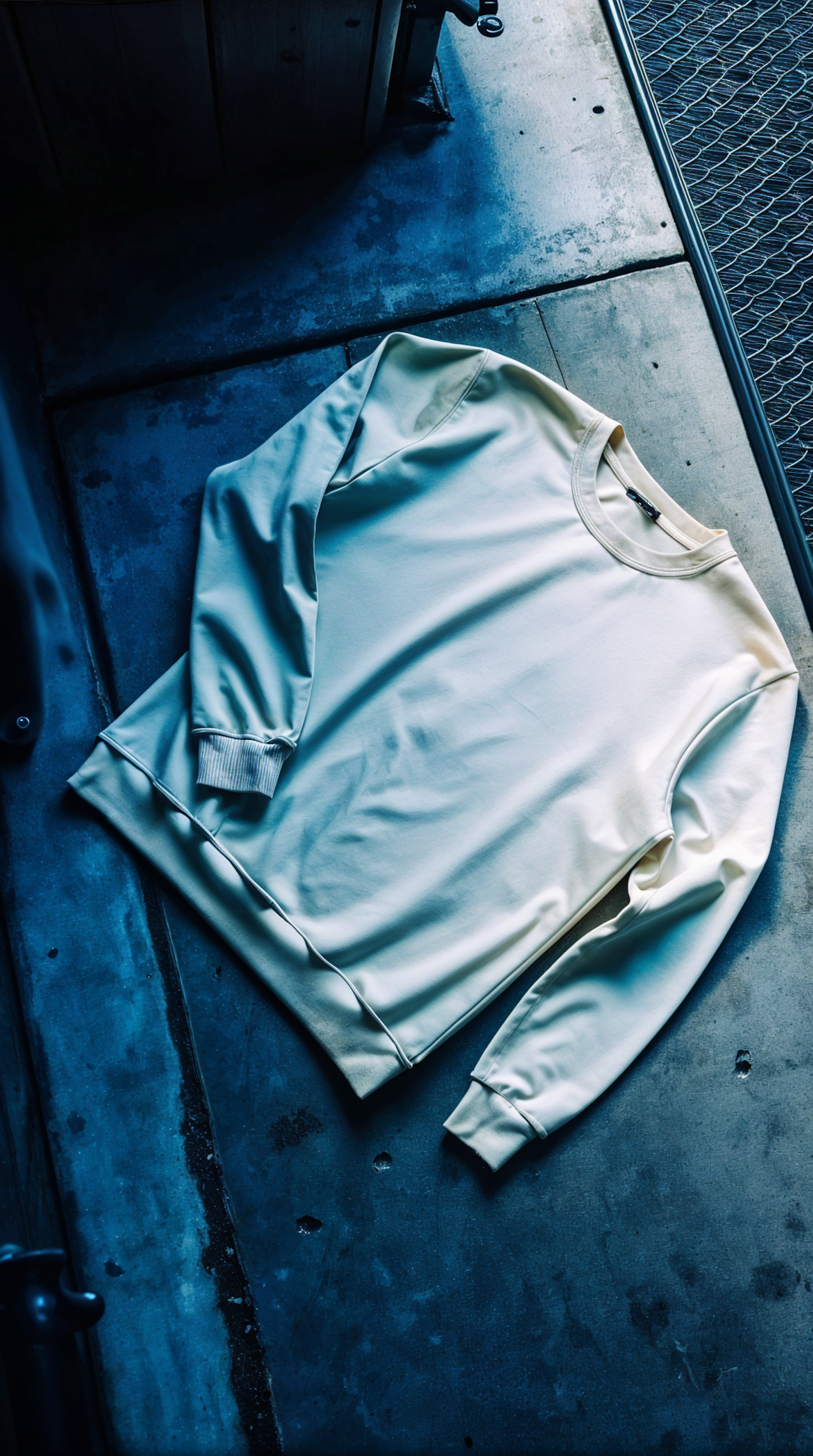 Cream sweatshirt on a textured concrete floor with cool lighting, highlighting its soft fabric and minimalistic design.