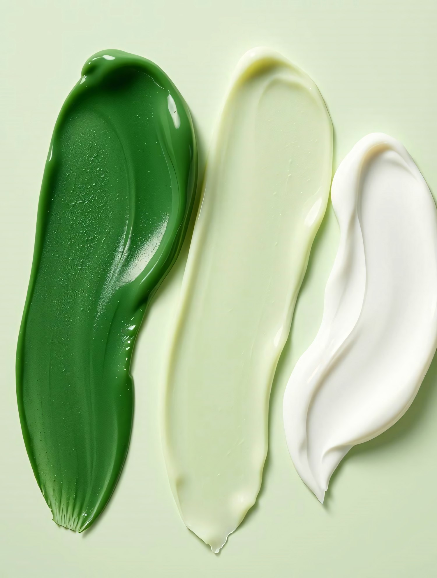 Three swatches of green and white creams on a light green background, showcasing their textures and finishes in a clean, minimal style.