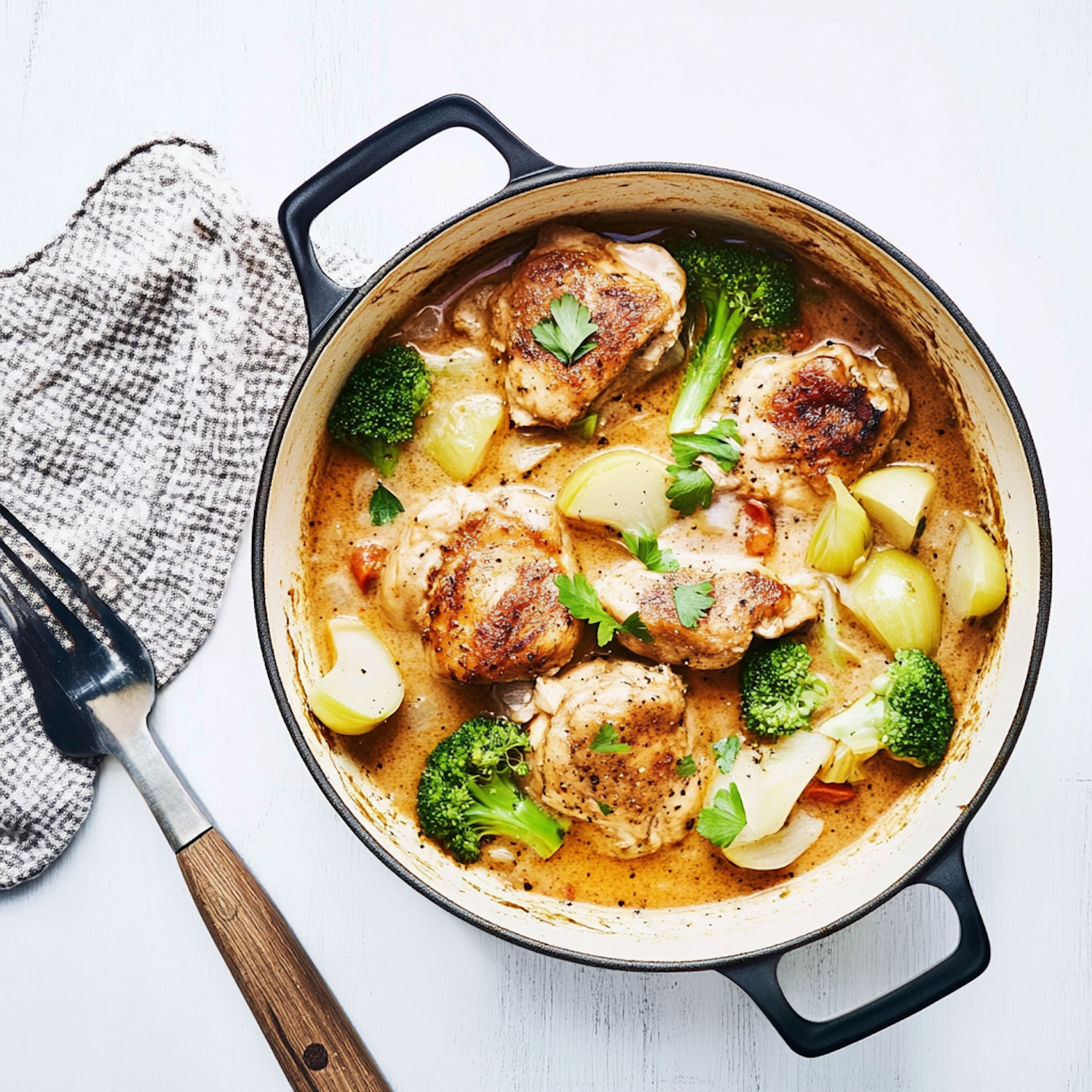 Golden chicken thighs with broccoli, potatoes, and onions in a creamy sauce, served in a cast-iron pot for a cozy, rustic meal.