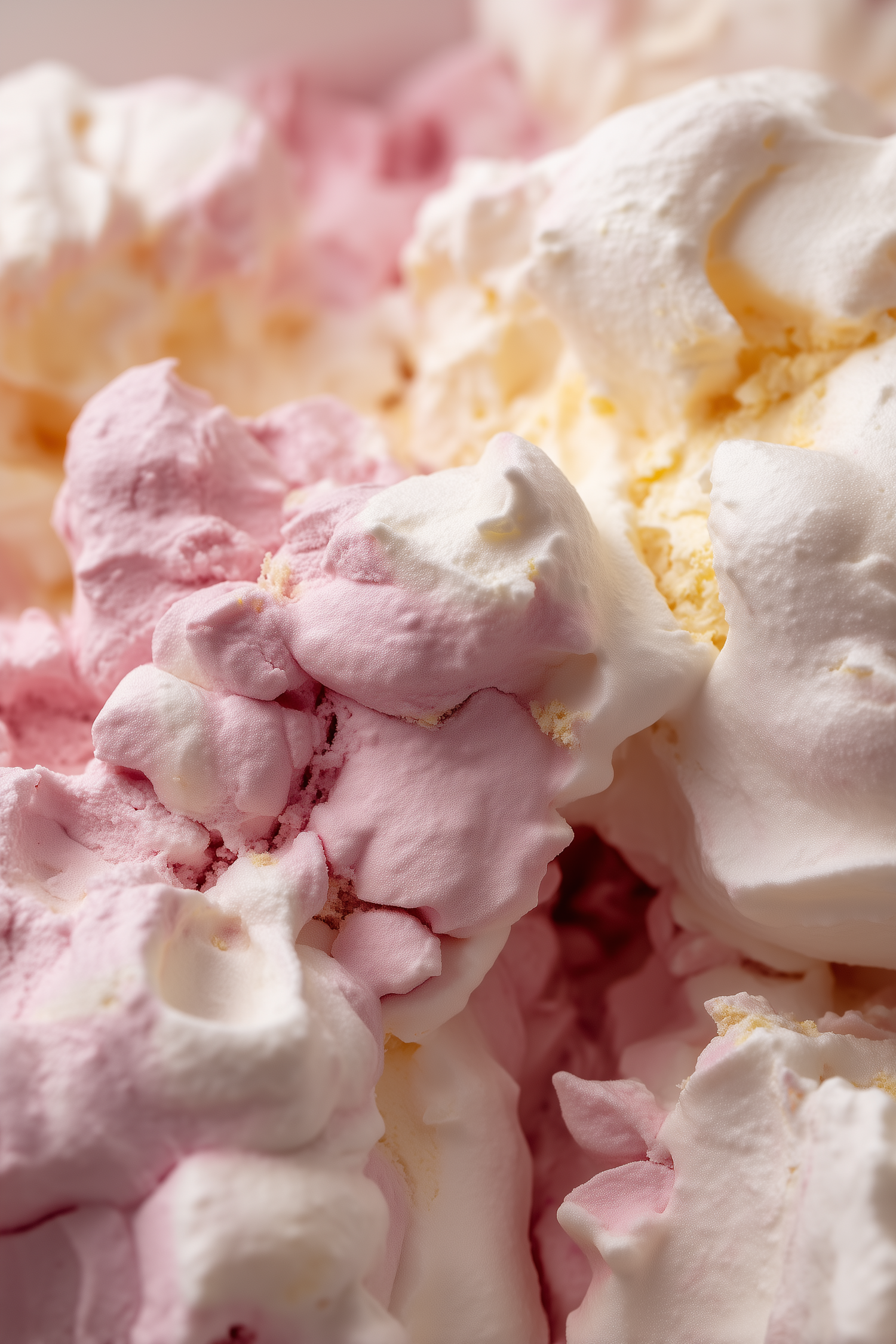 Close-up of a fluffy pink and white dessert with creamy textures, resembling whipped cream or ice cream. Perfectly indulgent!