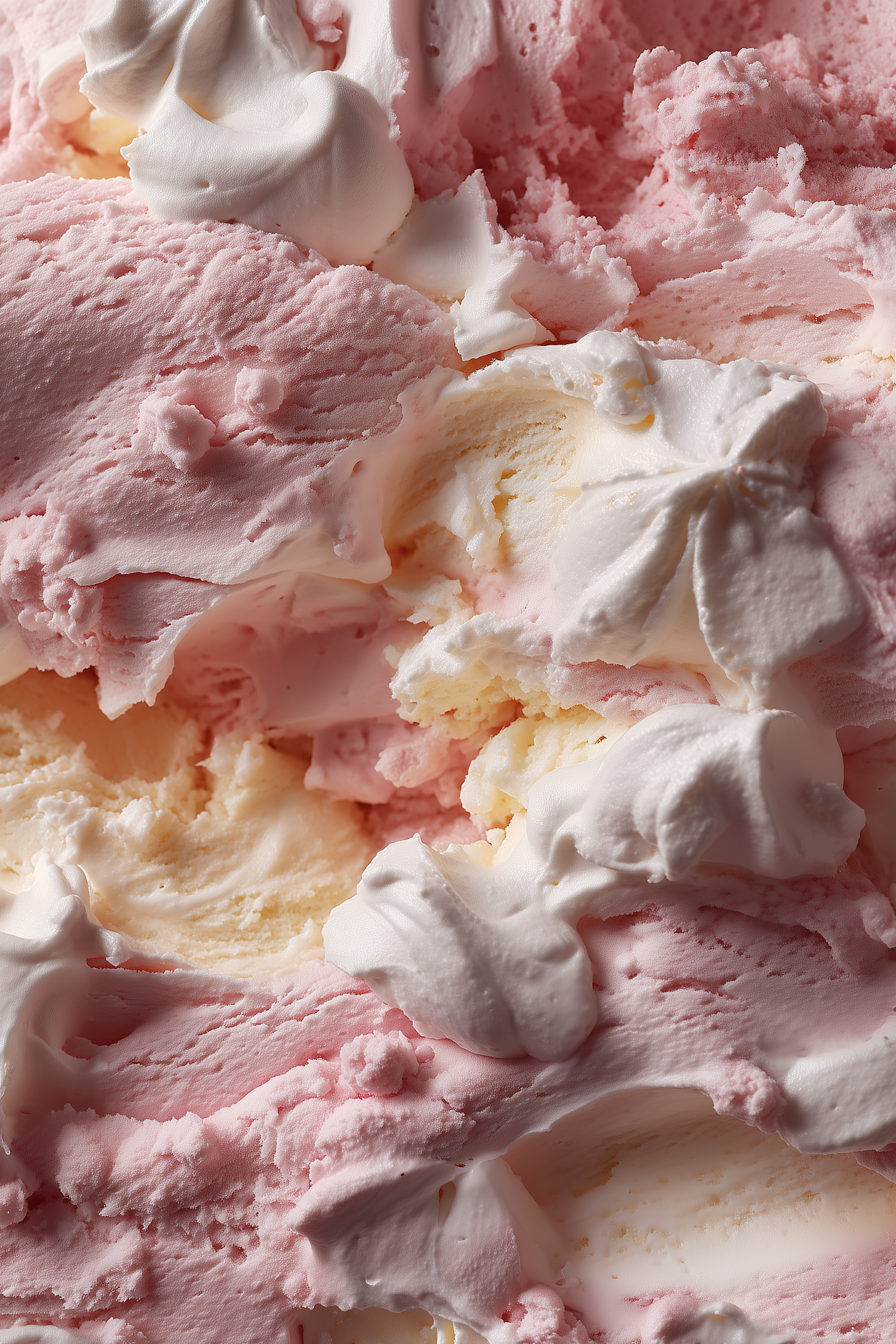 Close-up of pink and white swirled ice cream with a fluffy, creamy texture, perfect for dessert lovers craving a sweet treat.