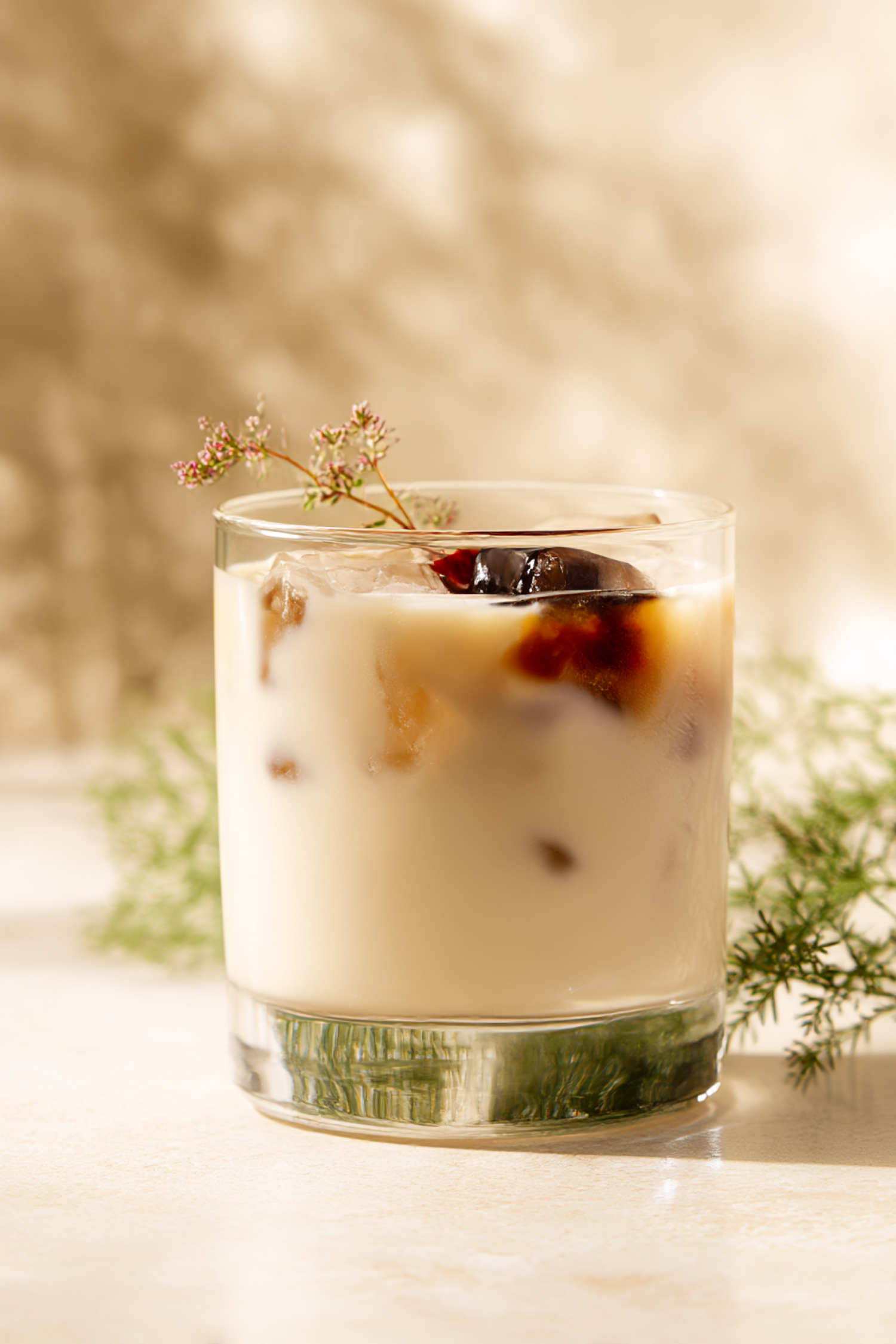A creamy iced drink in a glass, garnished with a floral sprig, set against a warm, blurred background for a refreshing aesthetic.